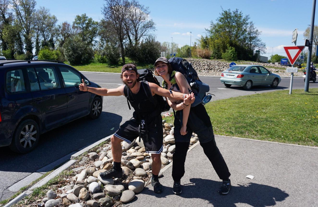 Et voilà, après tout ça, nous avons décidé de voler de nos propres ailes et nous sommes partis de Cavaillon en direction du Sud, avec l’envie féroce de rejoindre l’Italie. Armés de la bonne humeur qui a effacé la tristesse des adieux, nous avons débuté le stop et pas n’importe où : debout sur un bloc de béton à l’entrée d’un péage !