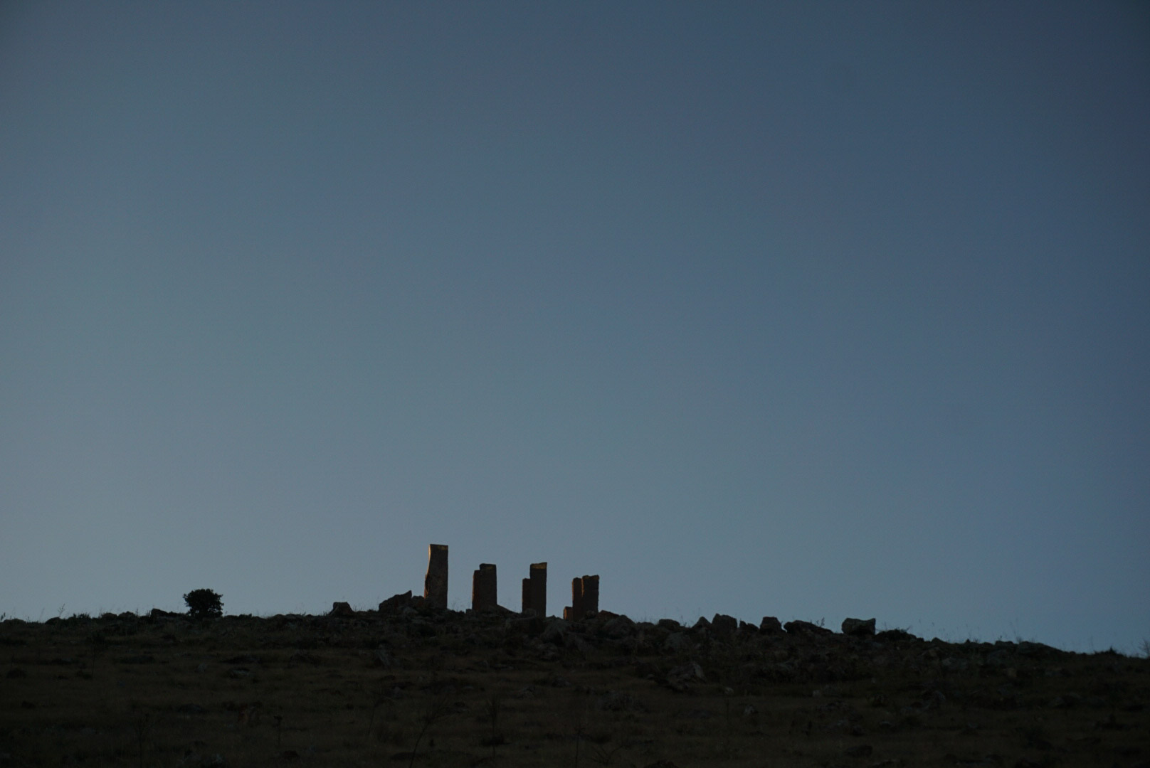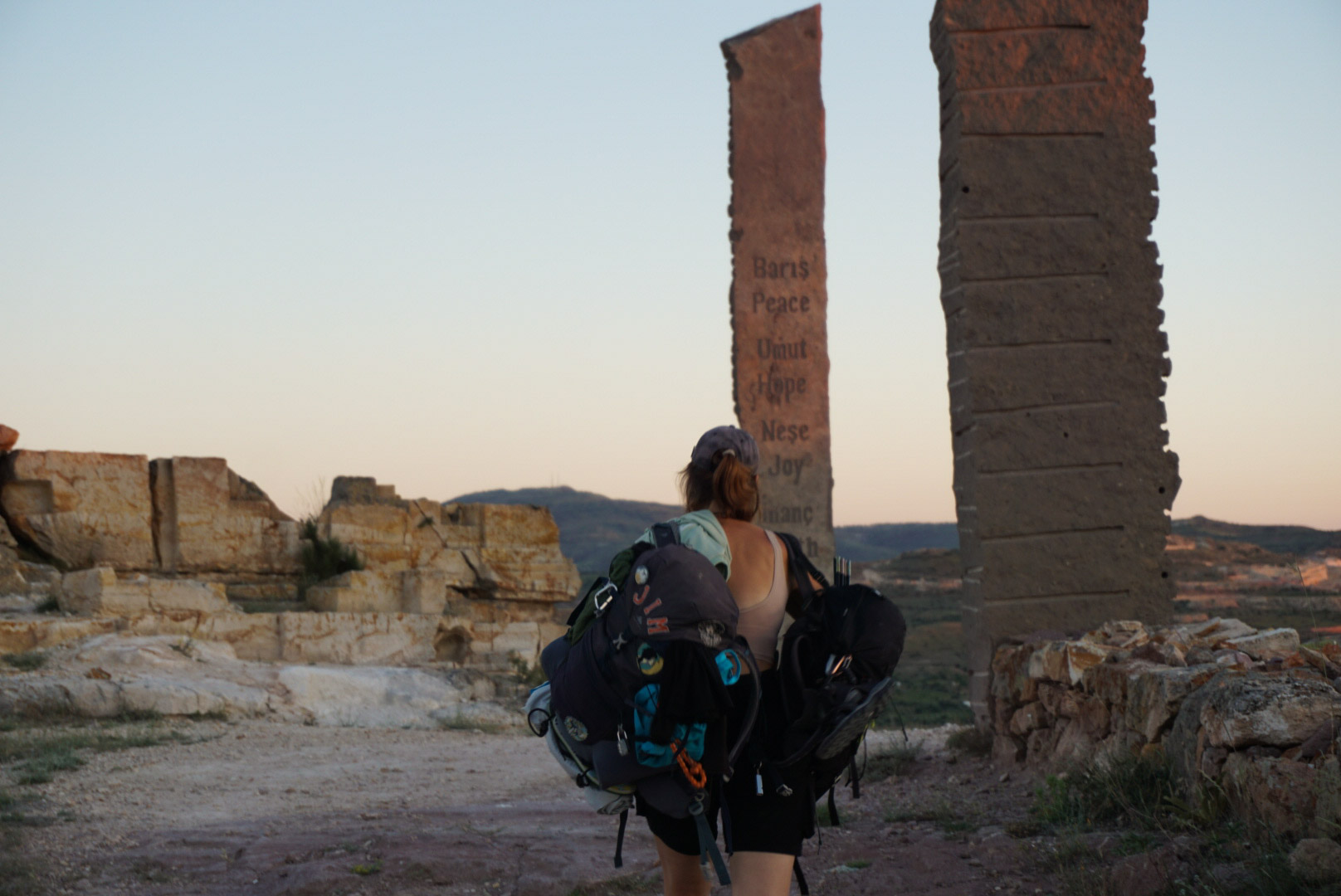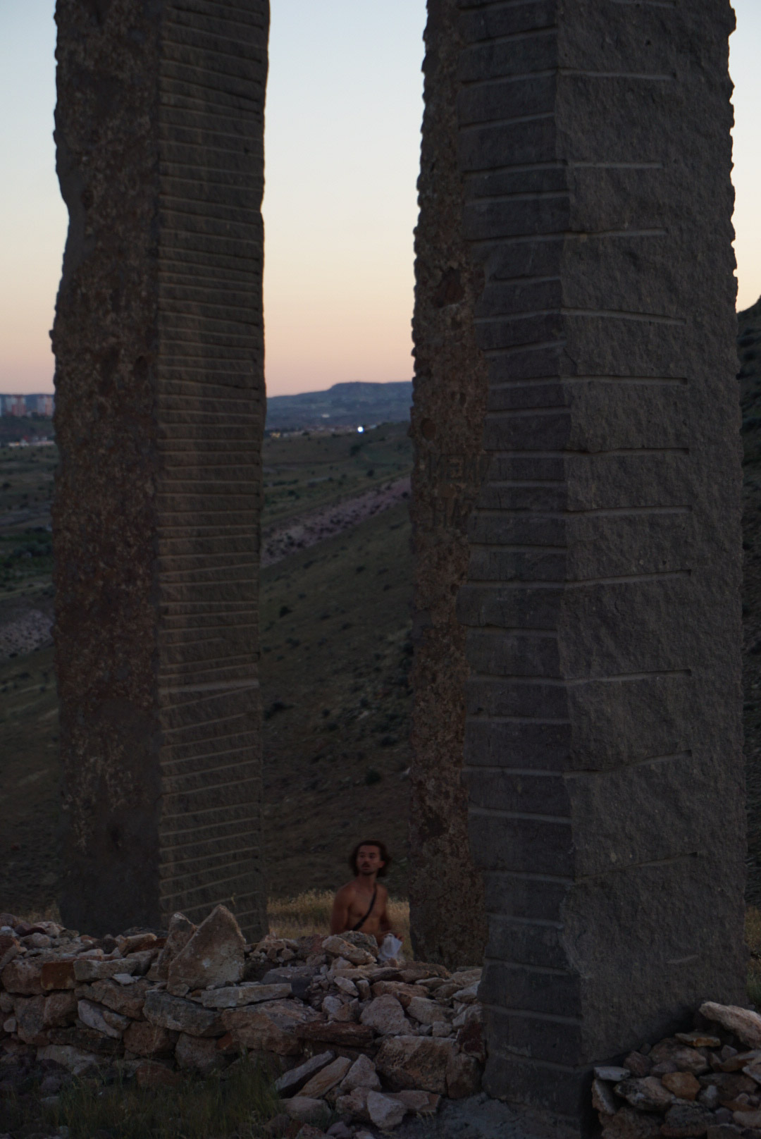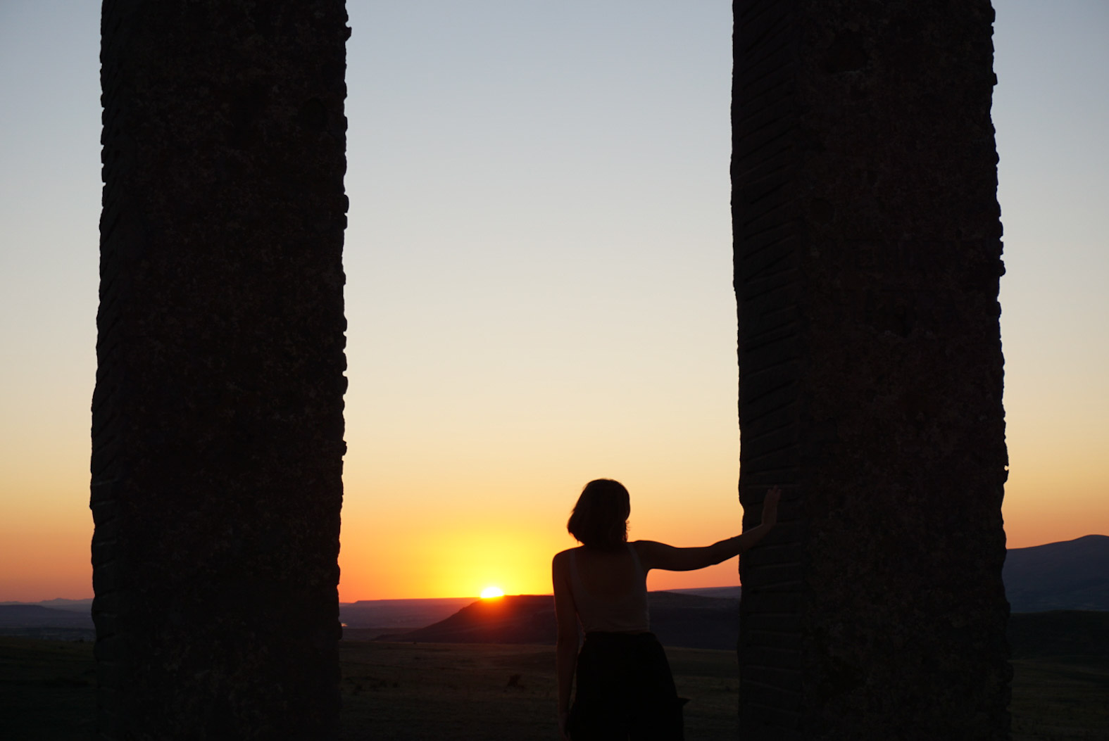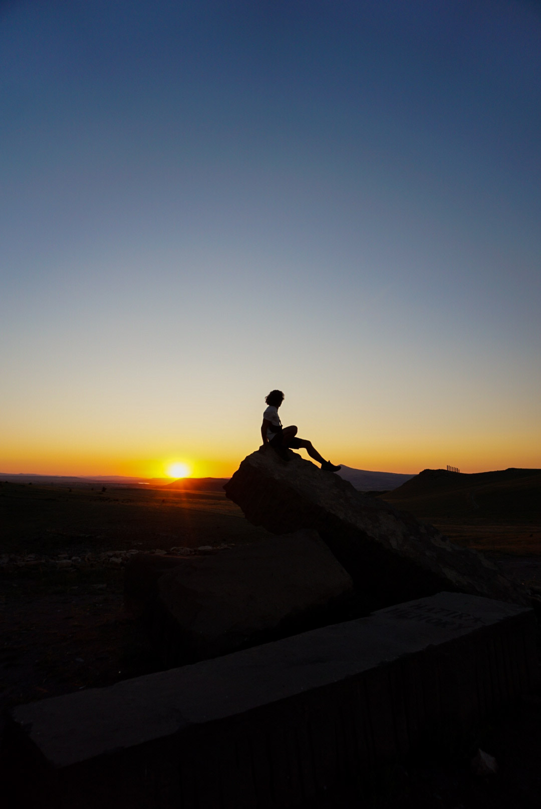 Après ceci, nous partons en vadrouille en direction de la vallée rose. Sur le chemin, on achète un bob pour lui et la dame qui parle couramment français discute avec nous autour d’un thé qu’elle nous offre dans sa boutique. Sur la route, à mi-chemin, alors que nous écoutons valse di fantastica, nous décidons de reporter la vallée rose à demain et d’aller dormir et voir les grandes constructions en pierre que nous apercevons au loin. Alex adore ce genre d’architecture. Nous y partons et après avoir esquivé une ferme avec 8 chiens qui nous aboyait dessus, passé un champ d’herbes piquantes, eu une appréhension face à un cheval et croisait un berger avec son troupeau, nous sommes arrivés en sécurité pour la dernière montée. Nous arrivons presque, je prends les affaires pour l’alléger et lui permettre de courir attraper les dernières photos avant le coucher du soleil. Nous arrivons, la vue est fort belle et on profite de ces teintes orangées pour prendre plein de photos. On pose la tente, mangeons le peu que l’on a pris en regardant la fin de la journée avant de contempler les étoiles. Au bout d’un temps, je pars dormir, même pas intimidée par une lumière suspecte au loin.