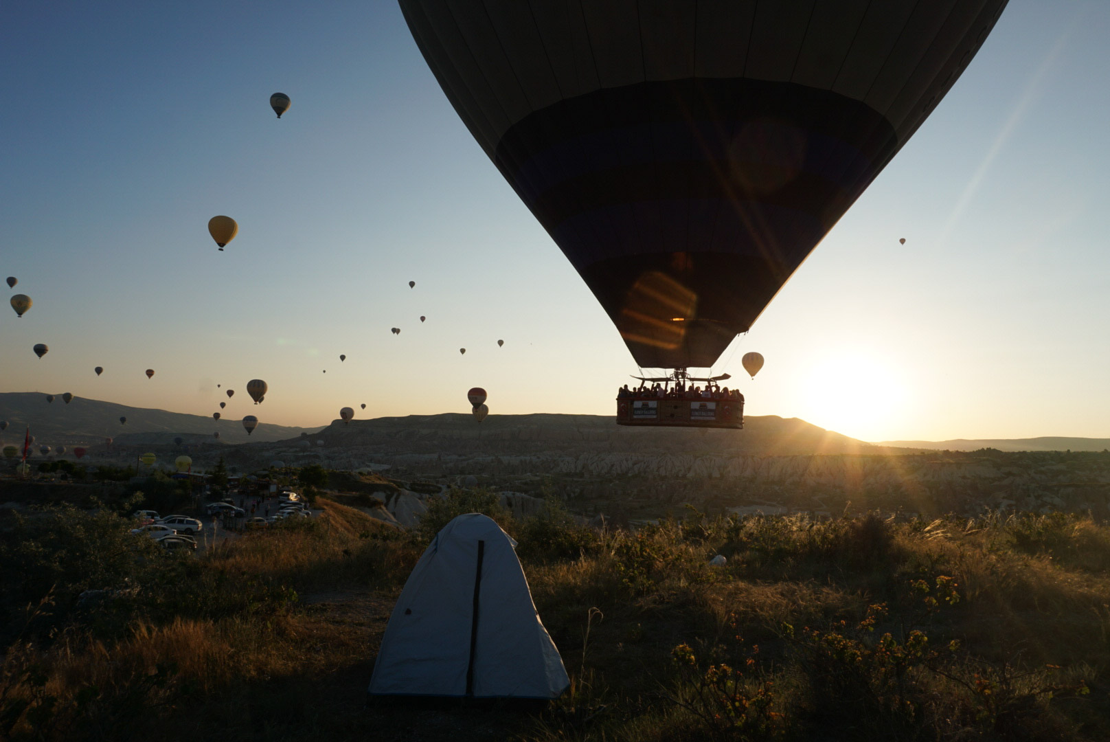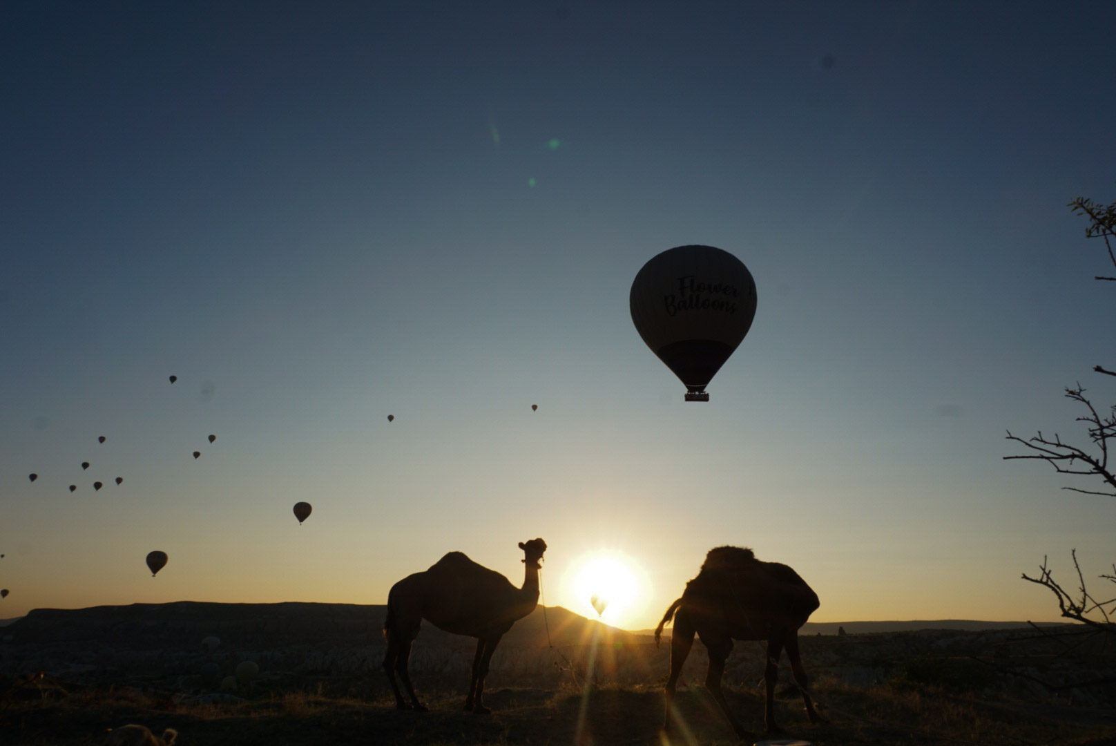 On repart dormir plus haut de la ville sur une colline où les touristes viennent le matin, on se sentira plus en sécurité. Nous arrivons en haut et tombons nez à nez avec deux dromadaires qui broutent et qui étonnamment nous mettent en confiance. Nous avons fait de très beaux clichés le lendemain des deux dromadaires et du lever de soleil accompagnés des montgolfières qui frôlent notre tente.