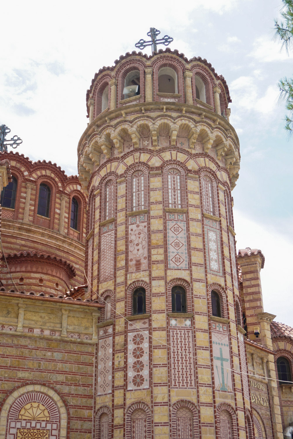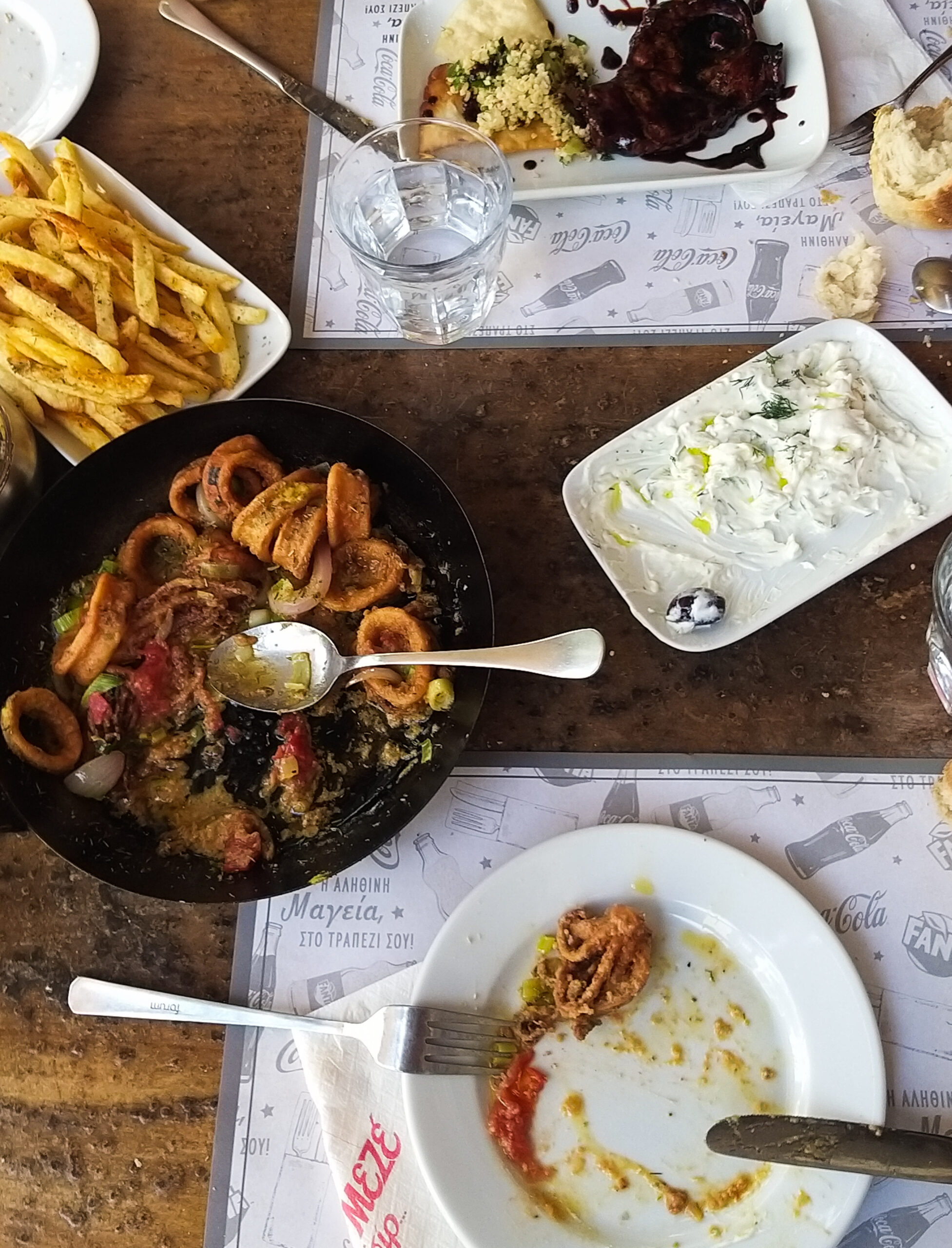 Un bus plus tard et nous voici dans le centre de la ville qui s’annonce vraiment agréable pour se balader et rempli de belles boutiques, de restaurants appétissants et de couleur. On se rend dans un restaurant qu’il a repéré auparavant pour manger des mezze (On est devenu fan de ce concept et on savoure chaque repas avec le simple fait d’avoir une multitude de petits éléments sur la table. À notre table à l’adresse que je vous joins ci-dessous : des calamars frits et rôtis au beurre avec des petits légumes (nouvelle tentative pour moi de les déguster, mais malgré le goût fabuleux de la sauce et l’odeur appétissante qui en émane, la texture me rebute et je ne peux toujours pas en manger), un steak avec une sauce sucrée certainement teriyaki et du miel, des frites avec des herbes de provence et du paprika (toujours au moins un des deux en Grèce) et notre culte, celui sans lequel on ne saurait vivre : le Tzatziki ! Également quelque chose qui nous plaît particulièrement, c’est le fait que nous avons toujours une table de 4 pour 2 personnes et pas parce que nous nous asseyons sur de grandes tables, elles sont faites ainsi, uniquement pour deux pour pouvoir poser les différents mezze et la jolie vaisselle qui les accompagnent souvent.