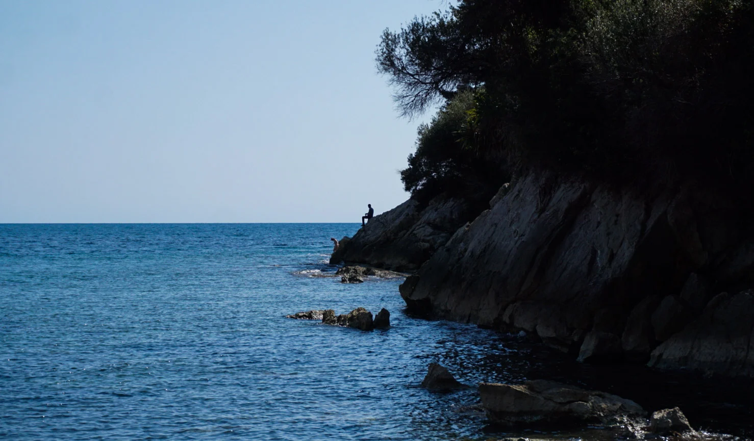 Après quelques plages et détours tout en gardant l’espoir de notre île, nous avons trouvé. Après une vision jolie d’un pêcheur en bord de roche en contrechamp qui se détachait de la nature. Après un verger qui semblait des plus appétissants. Et après avoir franchi une descente rocailleuse peu rassurante, la crique s’étendait devant nous.