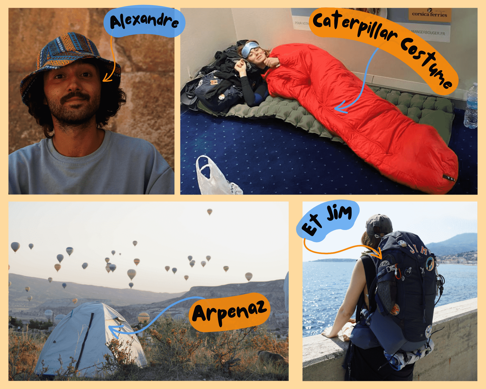 Avant de commencer, je vous présente ma petite équipe qui se compose donc de Jim mon sac à dos, d’Arpenaz notre tente, de mon Caterpillar costume et évidemment d’Alexandre mon acolyte de vie et de voyage.