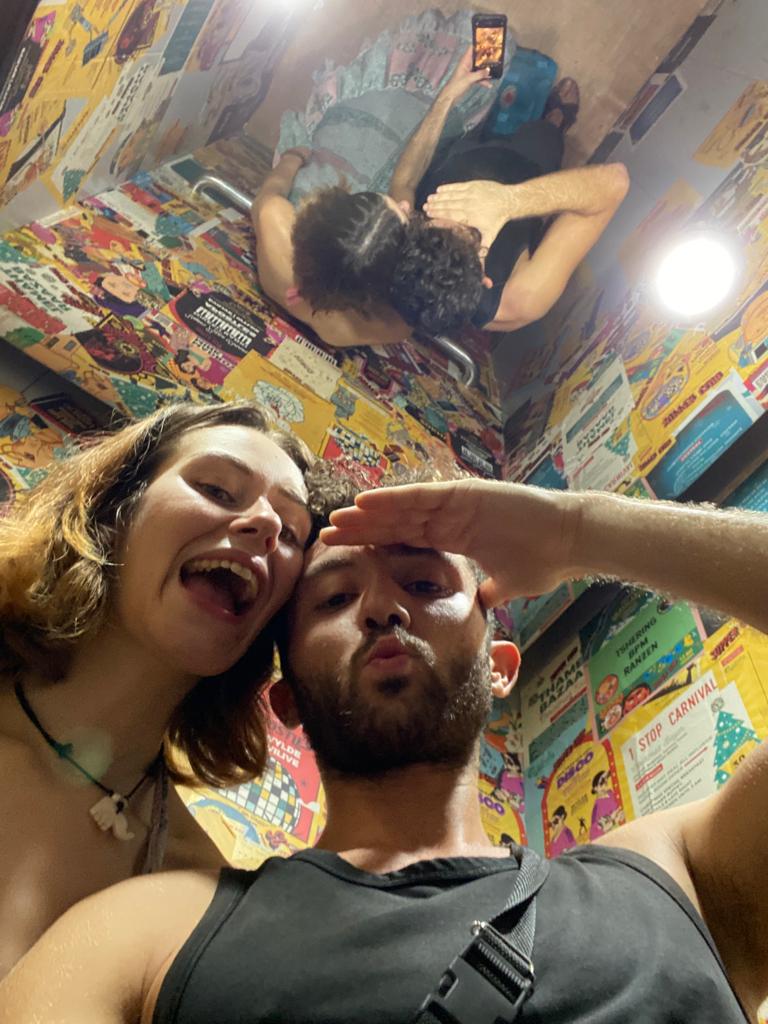 En sortant, on tombe sur des hordes de chauffeurs de taxi qui nous accostent. Il pleut des trombes, on est bien loin du centre alors on en prend un. Malin, on avait parlé dans la file à un Allemand et deux Israéliennes et on partageait le taxi tous ensemble. Je suis sur les genoux d’Ax, la chaleur est étouffante, la pluie rend le tout brumeux, on est heureux d’être ici.