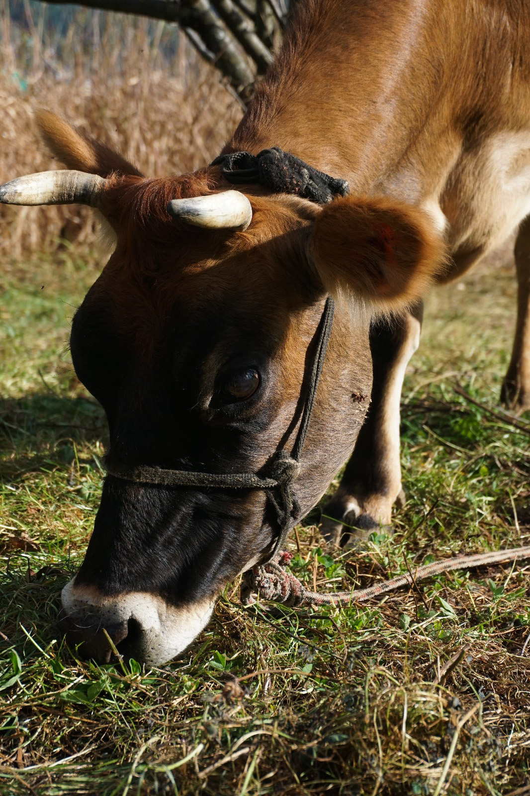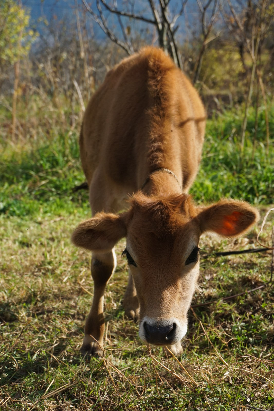 Tout d’abord l’un des acteurs majeurs de mes journées, c’est Salopette. Salopette, c’est la petite vache qui vit dans le champ en bas de chez nous. On peut l’approcher, car elle n’est pas entourée par une barrière, mais elle est attachée avec une corde autour de son cou à un arbre. La longueur de la corde ne me plais pas trop. Elle avait un peu faim, car il n’y avait pas assez a brouté donc j’allais lui déposer des légumes (du chou notamment). Ça lui faisait plaisir, elle avait l’habitude de me voir et je pouvais même parfois la caresser. Elle m’a bien donné le sourire et j’étais trop contente de la voir chaque jour et encore plus quand elle arrivait à s’enfuir de la corde et qu’elle pouvait vadrouiller.
