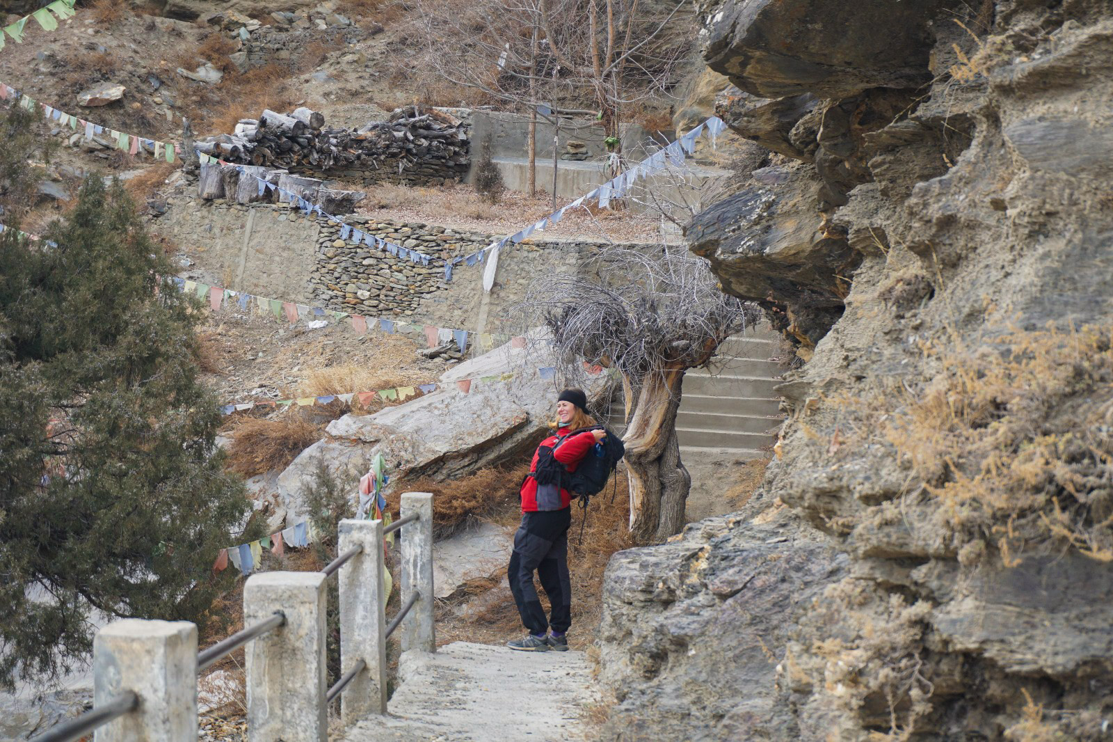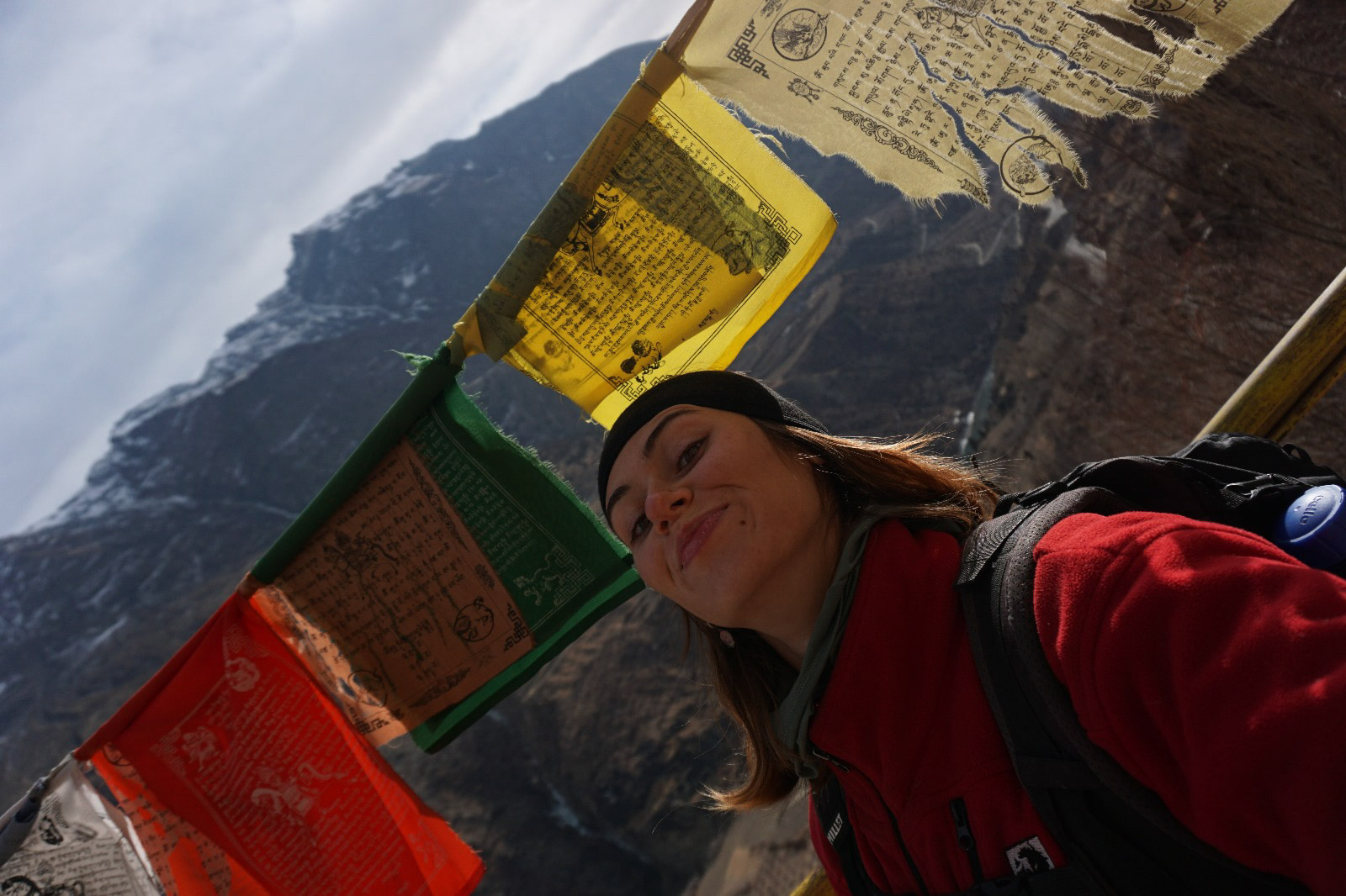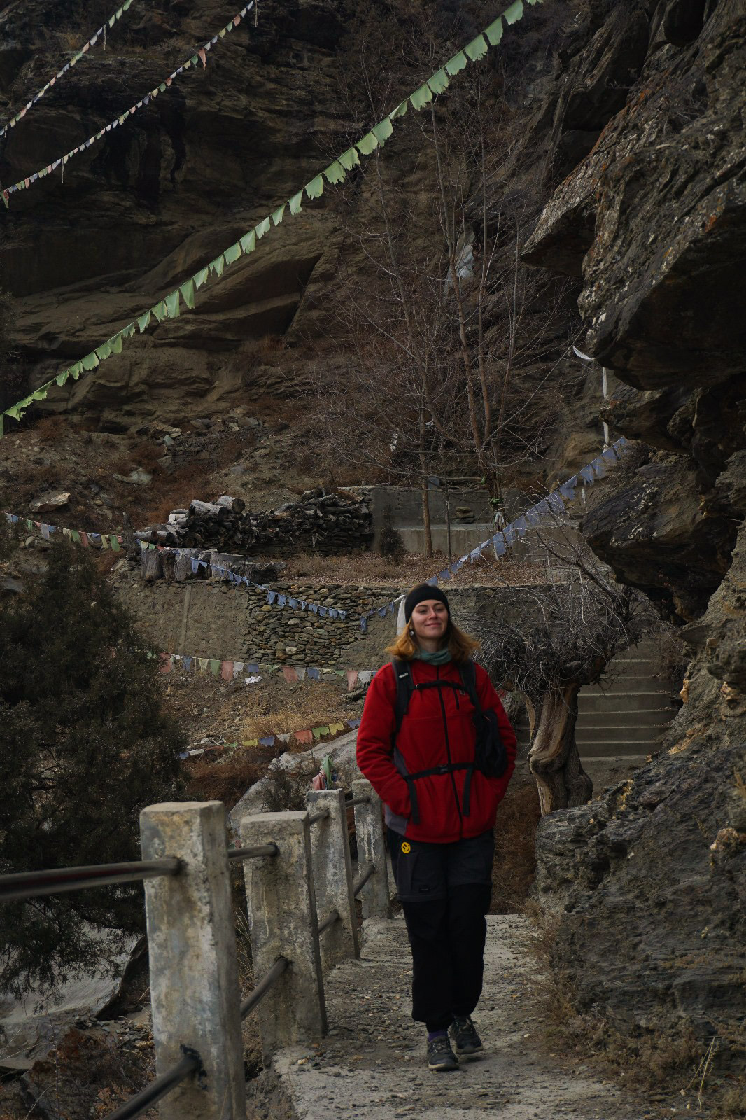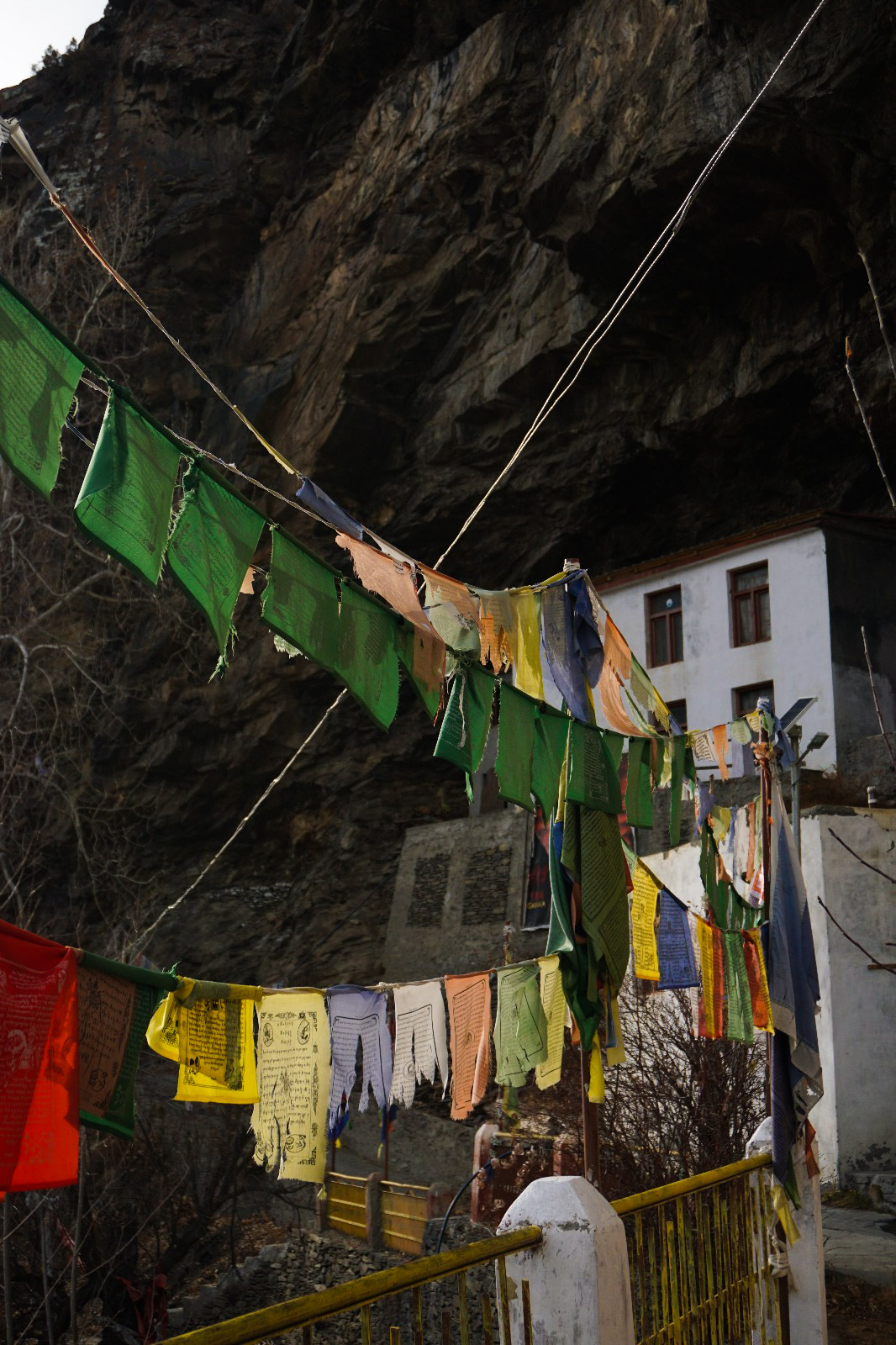 Nous repartons et nous tombons sur un monastère en haut de la montagne. On se gare, on commence à grimper les marches dans la roche pour atteindre le monastère. Tout le long de la marche, les drapeaux de prières tibétaines nous accompagnent. C’est vraiment trop beau. On sent l’aura autour de nous. On continue de grimper. Quelques petits ruisseaux parcourent le chemin et le bruit de l’eau est apaisant. Nous arrivons en haut, il n’y a pas grand-chose en haut, mais le bâtiment est joli, la vue est incroyable et nous commençons à explorer. Nous y sommes restés une bonne demi-heure. On redescend, car la nuit commence à tomber. Nous repartons et le vent est si froid que nos mains commencent à être douloureuses donc on décide de faire une nouvelle pause au même café. Une autre petite dame est dedans, autour d’un petit chauffage central. On la rejoint, on se met en cercle avec la proprio et la dame du début se met à nous passer des petites cacahuètes entières. On épluche les petites cacahuètes et on se réchauffe de nouveau avec le thé et le chauffage. On ne veut plus repartir tellement on sait qu’on va souffrir du vent dehors.