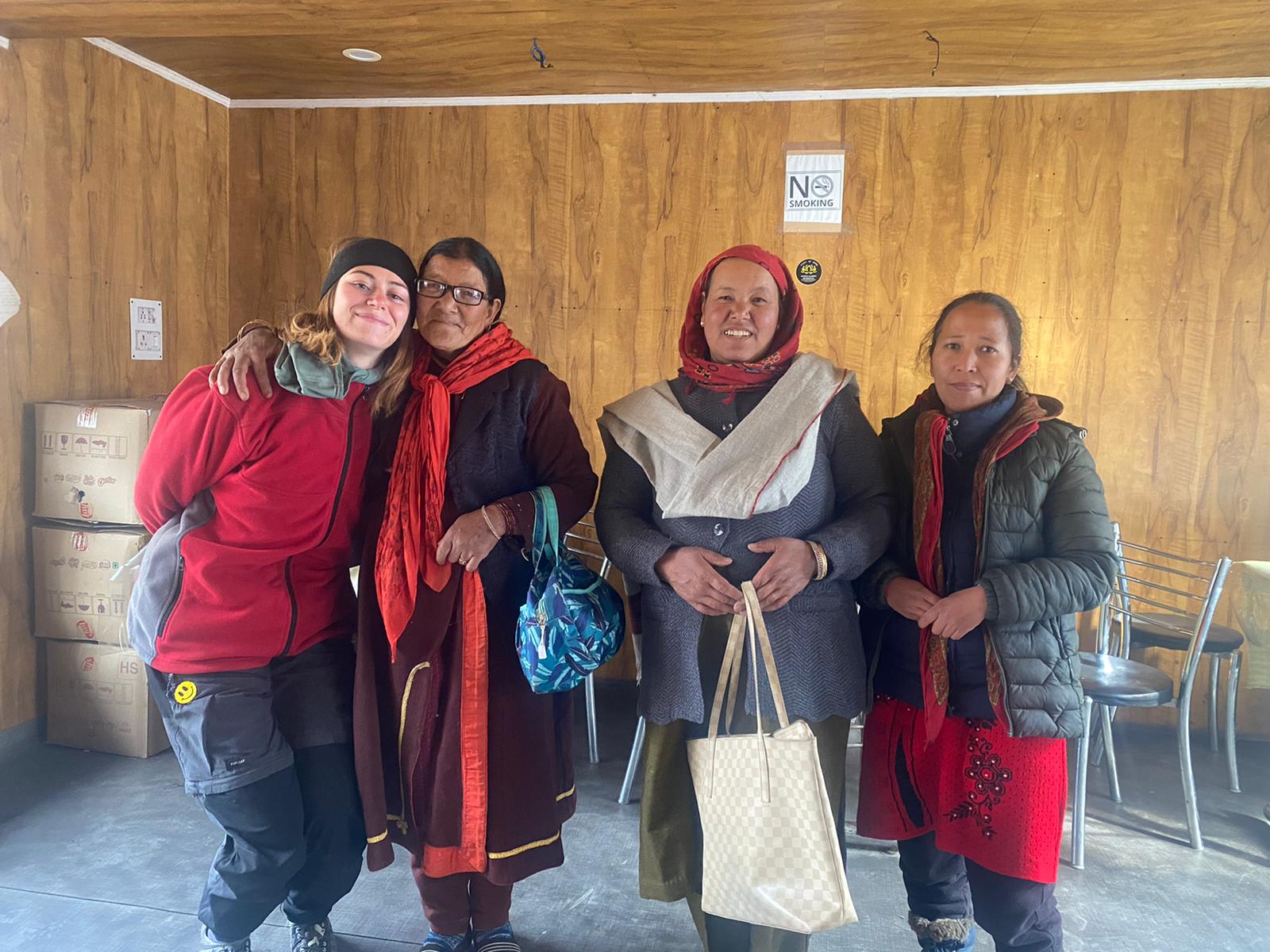 On repart et on traverse le tunnel. On continue d’avancer dans la montagne, la route est incroyable, le décor est digne d’un film clairement. Nous sommes dans les virages qui sont bordés de falaises rocheuses. On commence à avoir tellement froid que l’on s’arrête dans un tout petit café niché dans la montagne. On y rentre et un groupe de dames indiennes sont tranquillement en train de boire du thé. Elles nous regardent pas mal, car elles doivent rarement voir deux jeunes touristes européens dans ce coin-là. Elles rigolent un peu avec nous quand elles nous voient frigorifiés tout en attendant notre thé. On boit avec vue sur la montagne en souriant avec les petites dames. À la fin, on leur propose une photo et cette photo est adorable. Je n’ai pas les 5 sur la photo, mais rien n’empêche, c’était trop mignon.