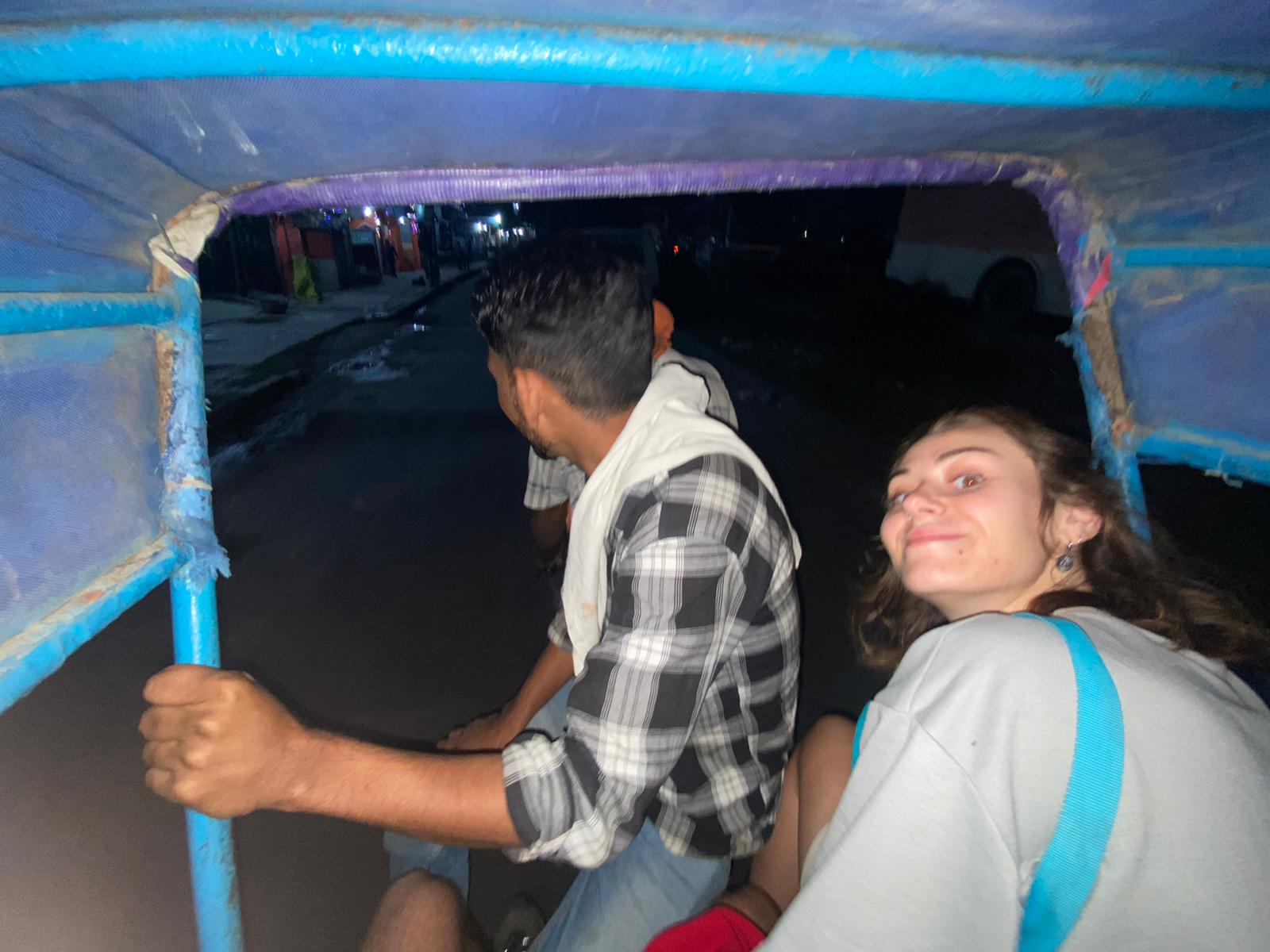 On repart ! Enfin, c’est ce que l’on croyait, car même si dans notre tête, on est dans Pékin express, on monte dans une espèce de pousse-pousse tirés par un Indien qui semble un peu fébrile. Je suis au comble de la gêne de me faire tirer par un inconnu à vélo à 3h du matin, et c’est loin d’être fini. On passe la frontière certes, mais la première seulement. Maintenant, qu’on a dépassé le no man’s land de l’entrée-sortie du Népal, il reste l’entrée en Inde. On monte en voiture avec un autre inconnu qui ne paye pas de mine. On commence à rouler. D’ailleurs, c’est la frontière la plus animée que j’ai vue surtout en pleine nuit. On se rend compte que les portières sont verrouillé. Je devrais avoir peur, mais bizarrement en Inde, j’ai tellement l’habitude que je reste sereine. Alexandre, lui, ne semble pas aussi serein. On descend quelques minutes plus loin pour le second tampon. Je vois le chauffeur de la voiture cracher du sang et je commence à suer. J’ignore, je tamponne le passeport rapidement, car on nous fait passer devant tout le monde. On remonte en voiture et je commence à me questionner sur la drogue que prend ce monsieur qui nous conduit. On s’enfonce dans le noir, dans les champs et on quitte peu à peu la civilisation, tellement que l’on arrive sur une route déserte. Pourtant, on n’en avait jamais vu en Inde.