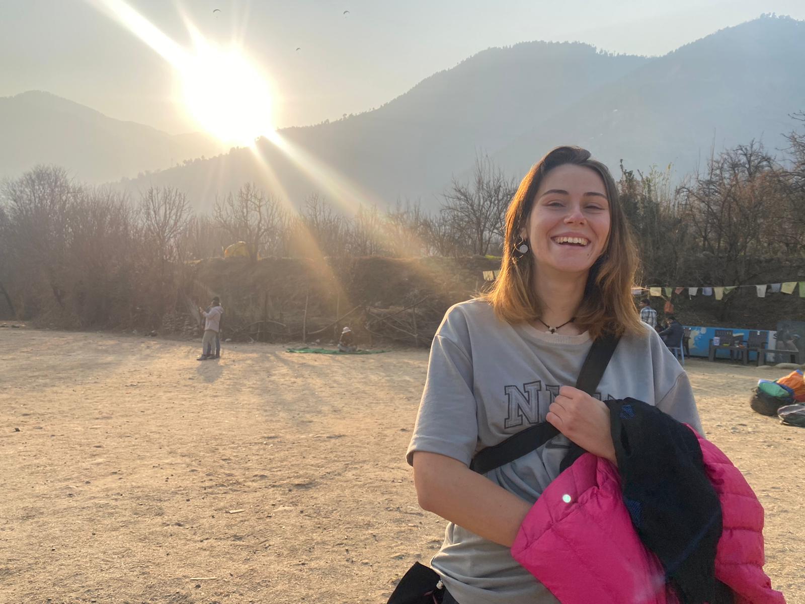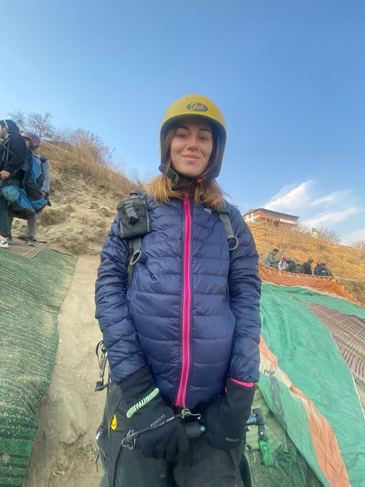 On part prendre le bus, j’ai des crampes depuis le matin, mais ça ne me décourage pas. Nous montons dans le bus, on s’assied devant, la petite musique est super sympa et les petits bibelots du bus se balancent en rythme. Le trajet est sympathique, dure environ 30min, j’adore la vie indienne dans le bus. On descend, on rencontre l’équipe du parapente. Des mecs grave chill qui nous font monter en jeep avec tout le matos des parapentes. On adore le mood de partir entre potes avec les parapentes pour sauter. J’avoue que même si je suis à l’initiative de ce périple, j’ai un mini stresse masqué au début par de l’excitation puis par la nausée qu’on a tous les deux lors du trajet en jeep qui secoue énormément. On arrive, on se fait déposer et la bim en deux secondes, j’ai un casque sur la tête, un harnais autour de moi avec un siège pour l’atterrissage accroché qui me fait galérer à marche, on dirait que je porte une couche. On attend et un quart d’heure après avoir vu pas mal de gens sauter, c’est notre tour. Ax part en premier, je ne veux pas qu’il me voie me péter la gueule si je me loupe. Je pourrais penser le contraire et vouloir qu’il soit fier, mais je suis quelqu’un qui sent vite la honte. Quand je tombe en rando, le premier réflexe que j’ai est de lever les yeux vers lui et de vérifier qu’il ne m’ait pas vu. Je n’assume rien, rien du tout et surtout pas les chutes.
