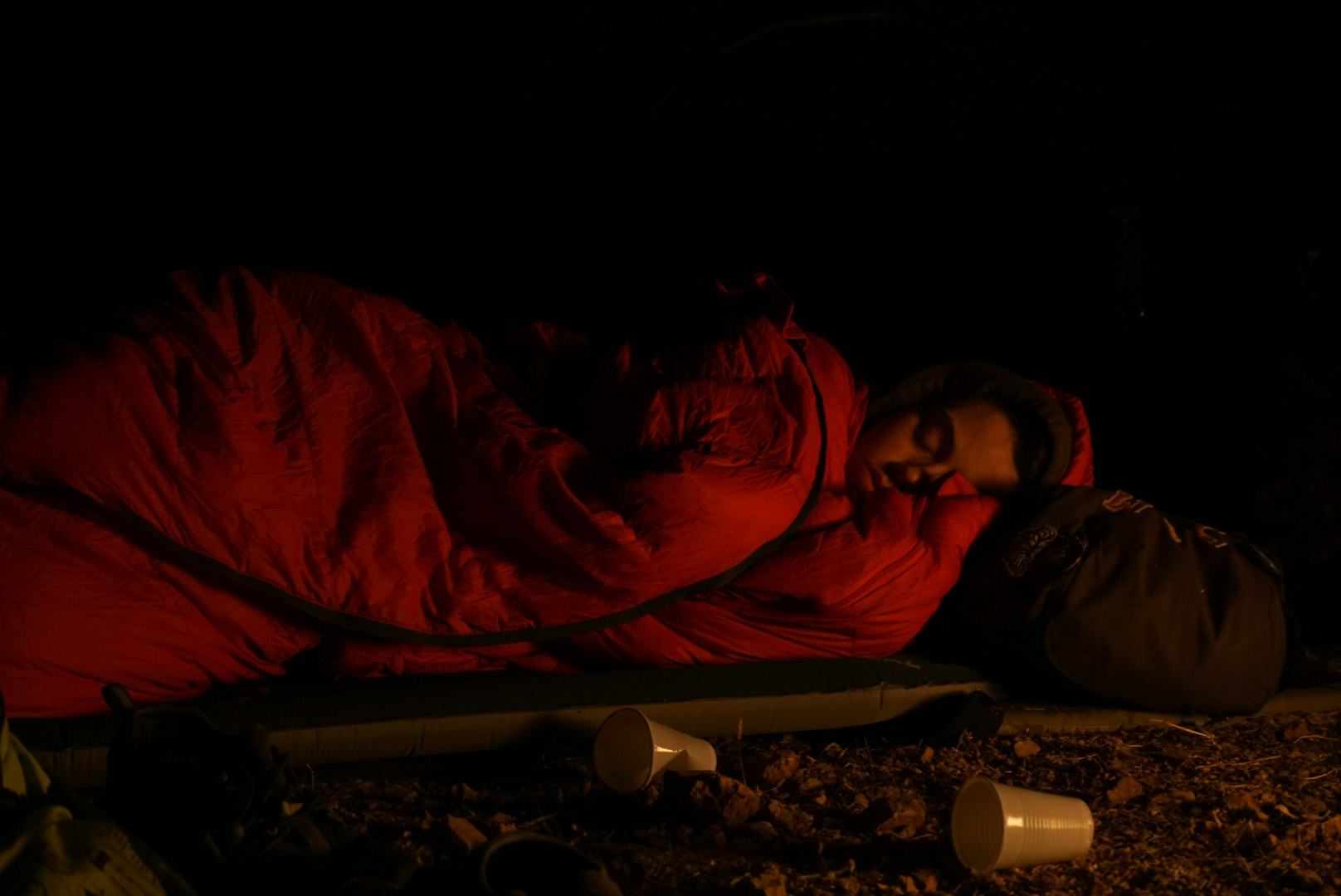 On monte le camp, il fait déjà nuit quasiment, je ramasse plein de branches. Les garçons essayent de couper de plus grands troncs pour faire durer le feu pendant la nuit. On monte le camp, il fait déjà nuit quasiment, je ramasse plein de branches, les garçons essayent de couper de plus grands troncs pour faire durer le feu pendant la nuit.