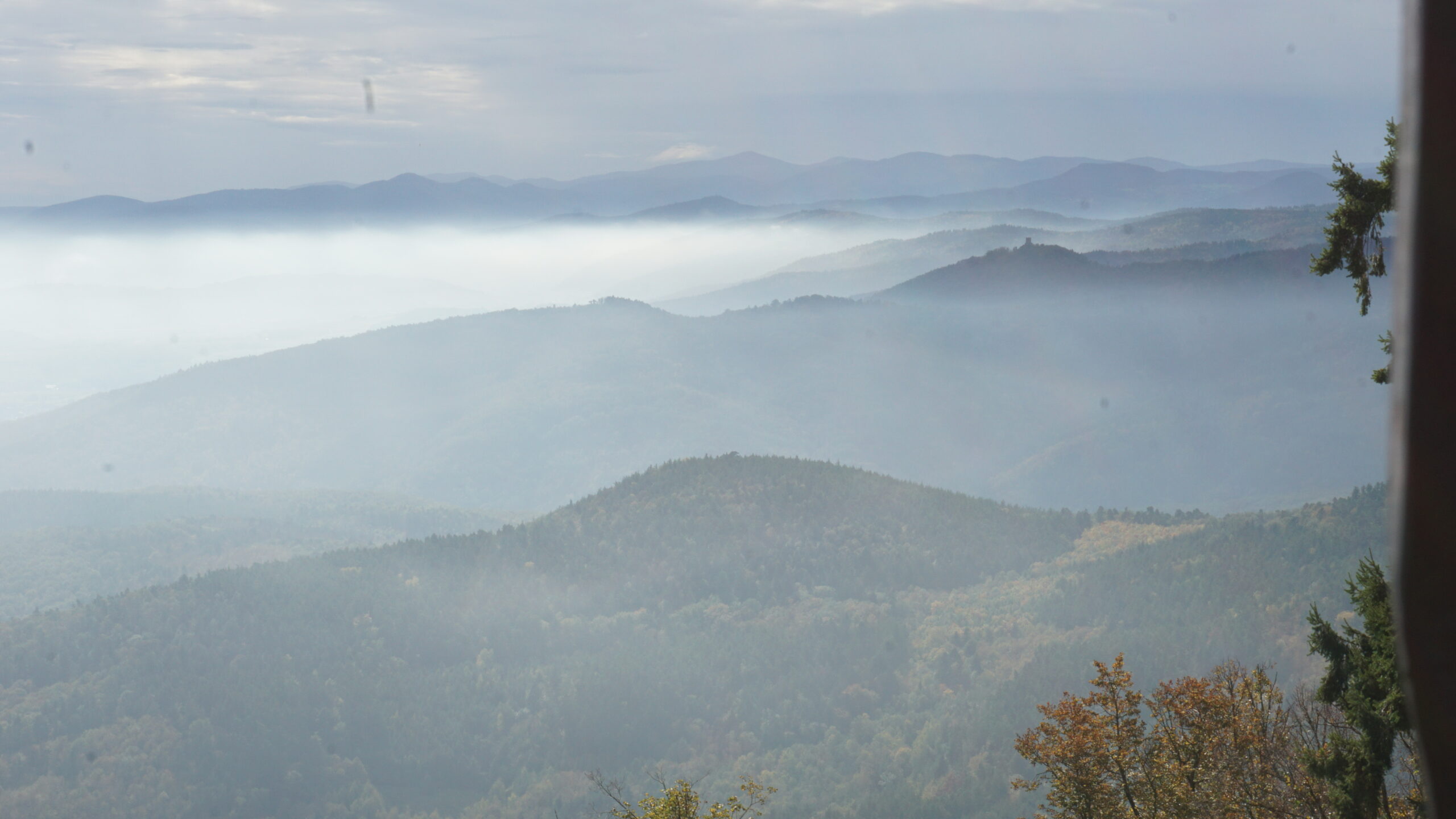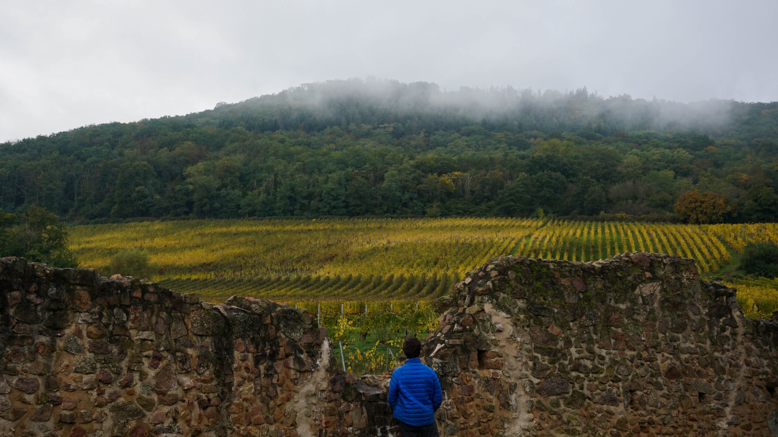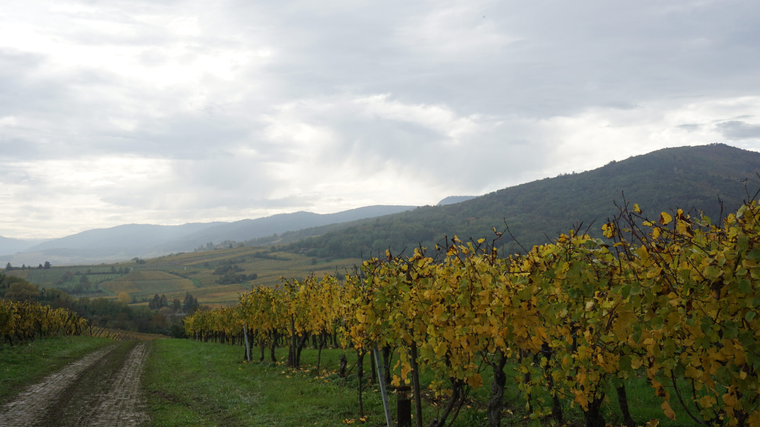 On rejoint la voiture et on repart à Thannenkirch qui est un autre village plus haut dans la vallée. Sur la route, on passe sur un sentier entre les vignobles jaune qui recouvrent les vallons. La vue est vraiment belle alors on s’y arrête de faire quelques photos avant que les petites gouttes de pluie ne viennent sublimer ce décor.
