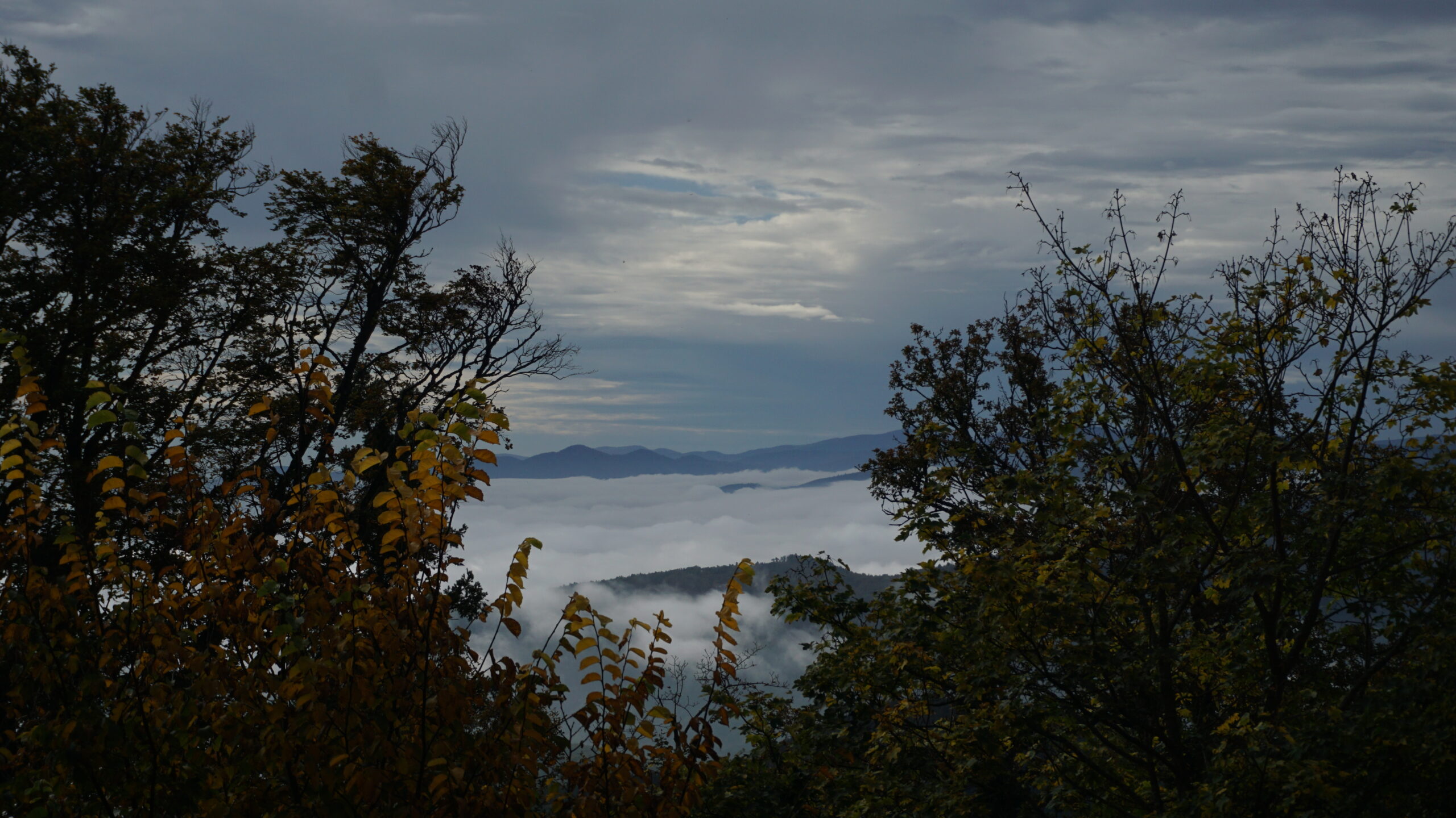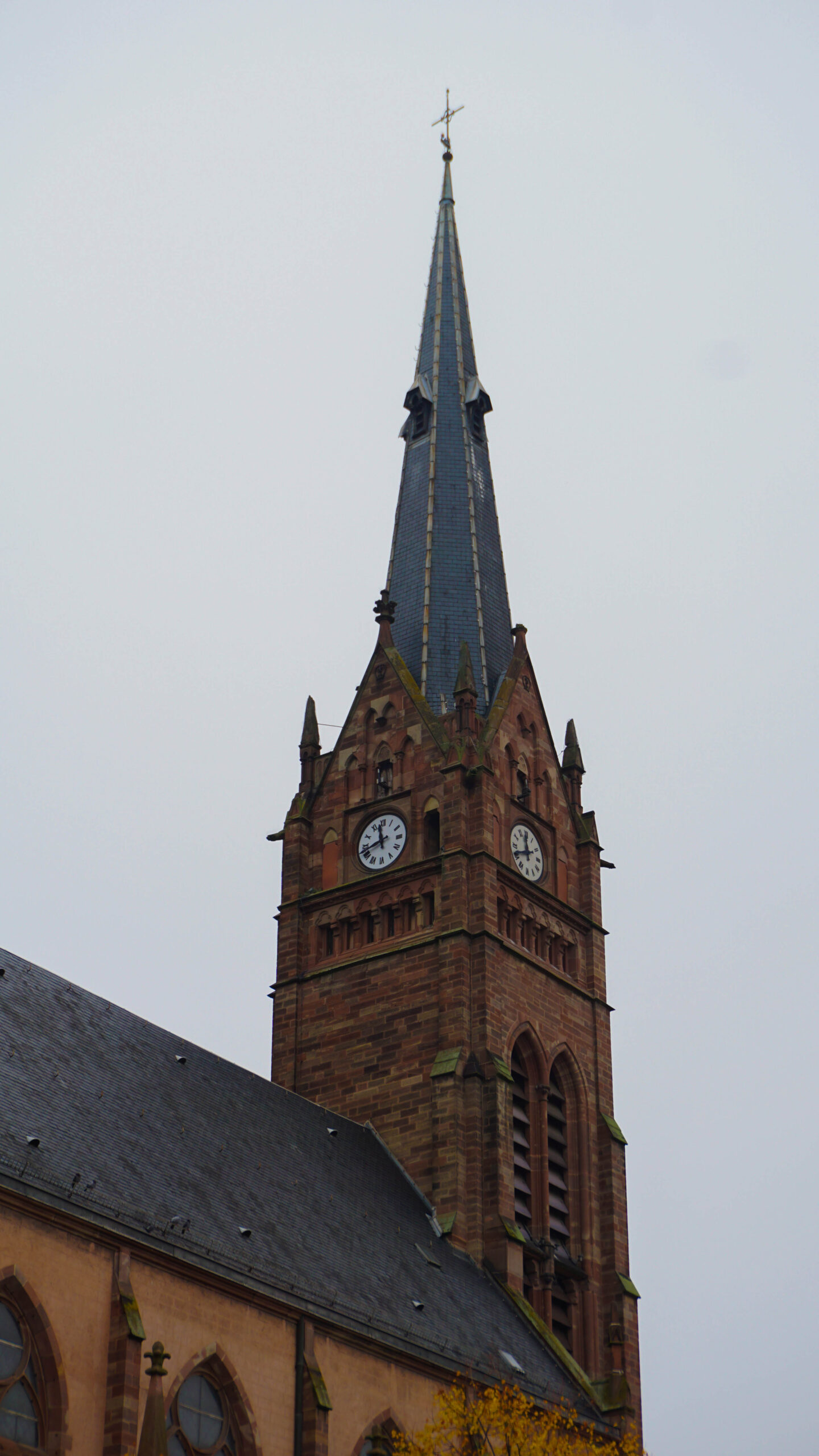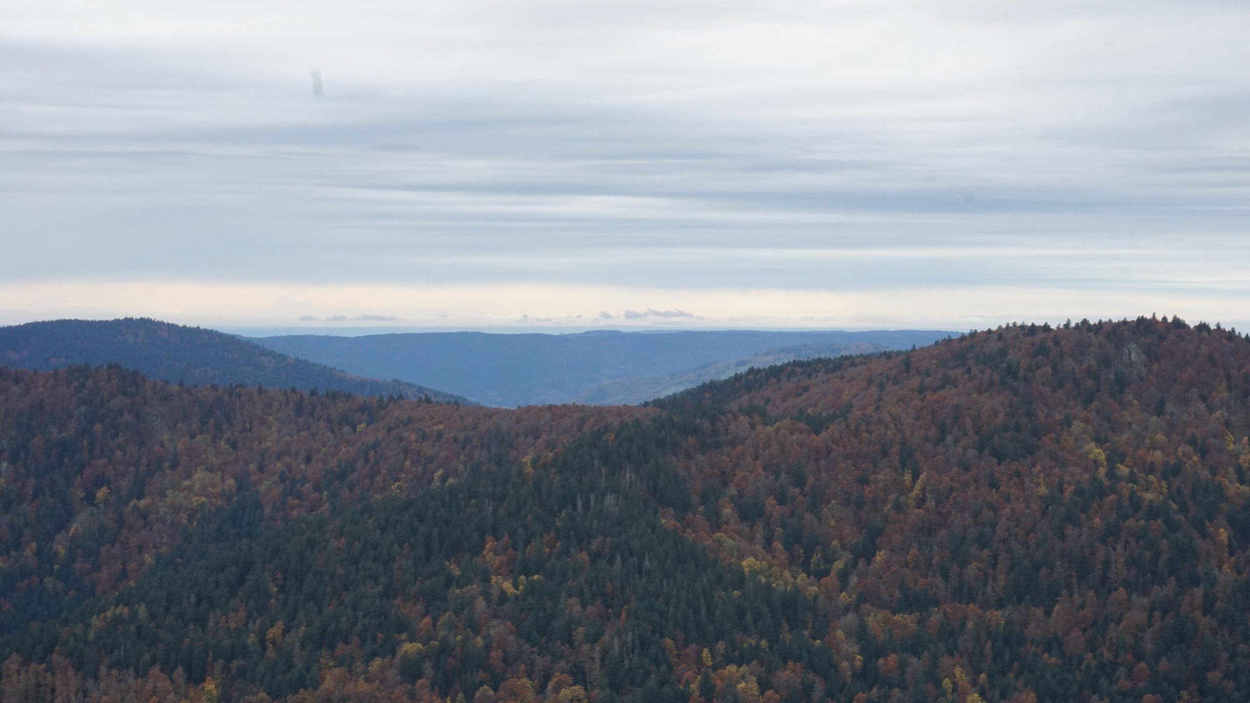 On rejoint la voiture et on repart à Thannenkirch qui est un autre village plus haut dans la vallée. Sur la route, on passe sur un sentier entre les vignobles jaune qui recouvrent les vallons. La vue est vraiment belle alors on s’y arrête de faire quelques photos avant que les petites gouttes de pluie ne viennent sublimer ce décor.