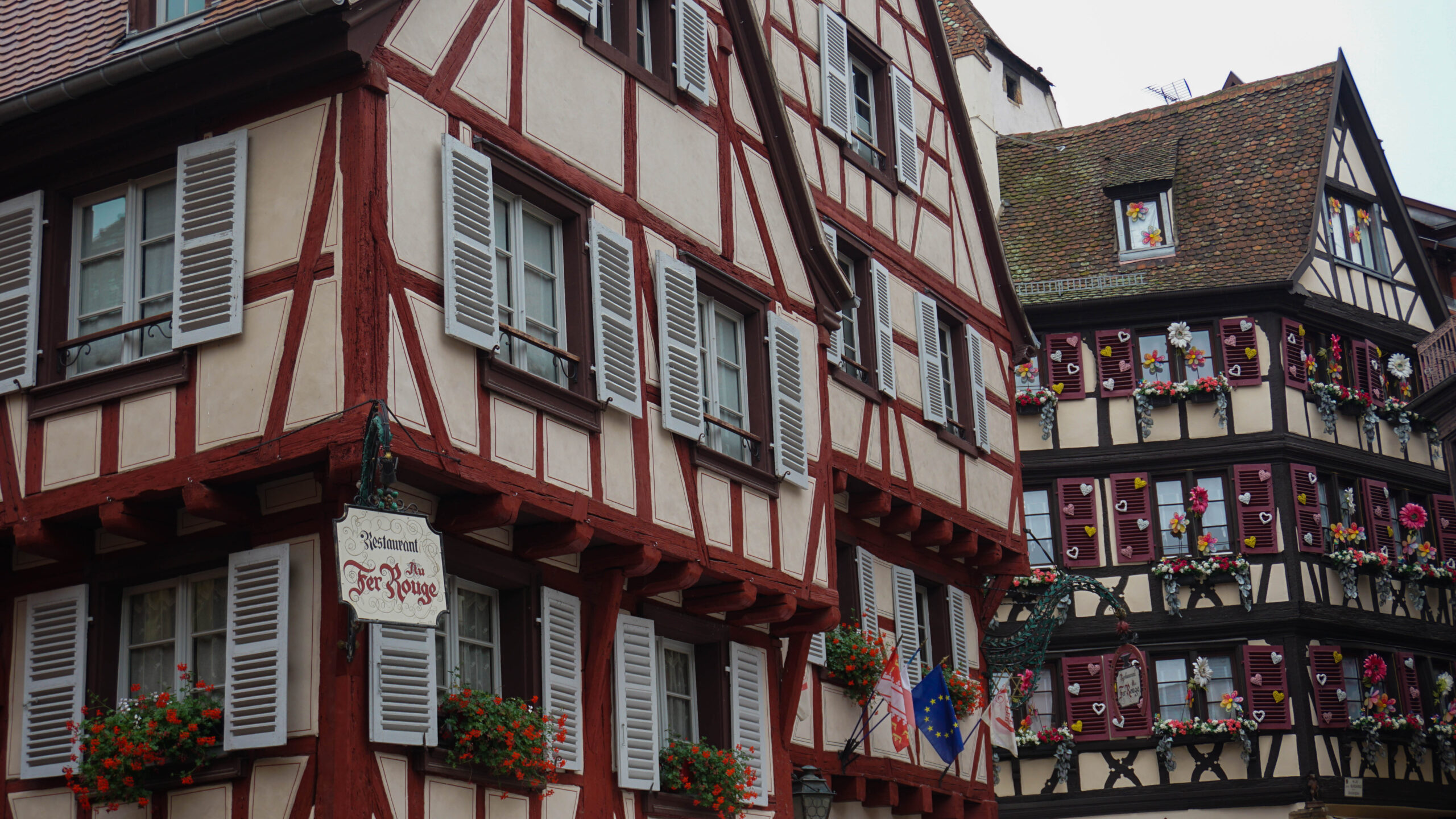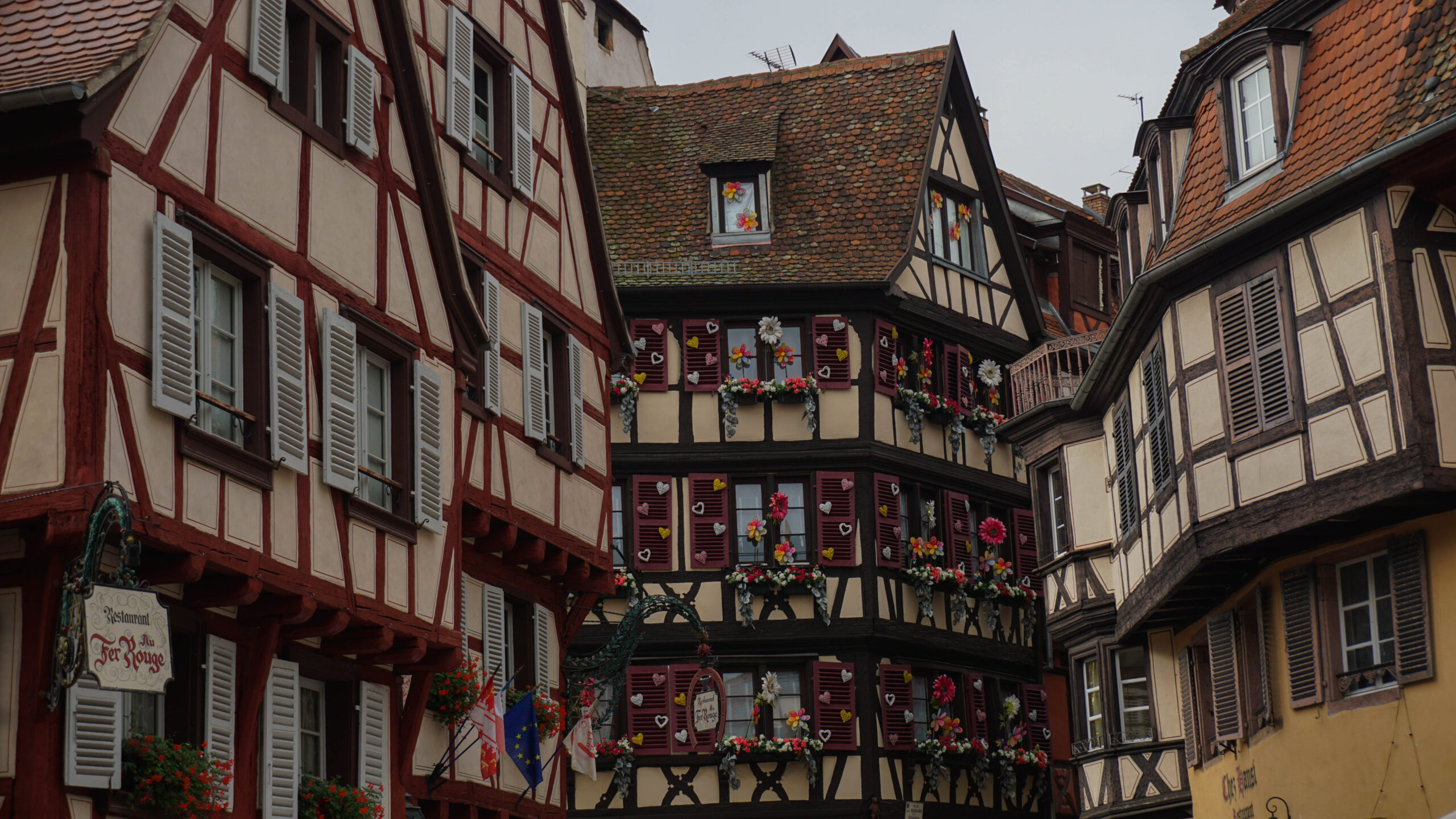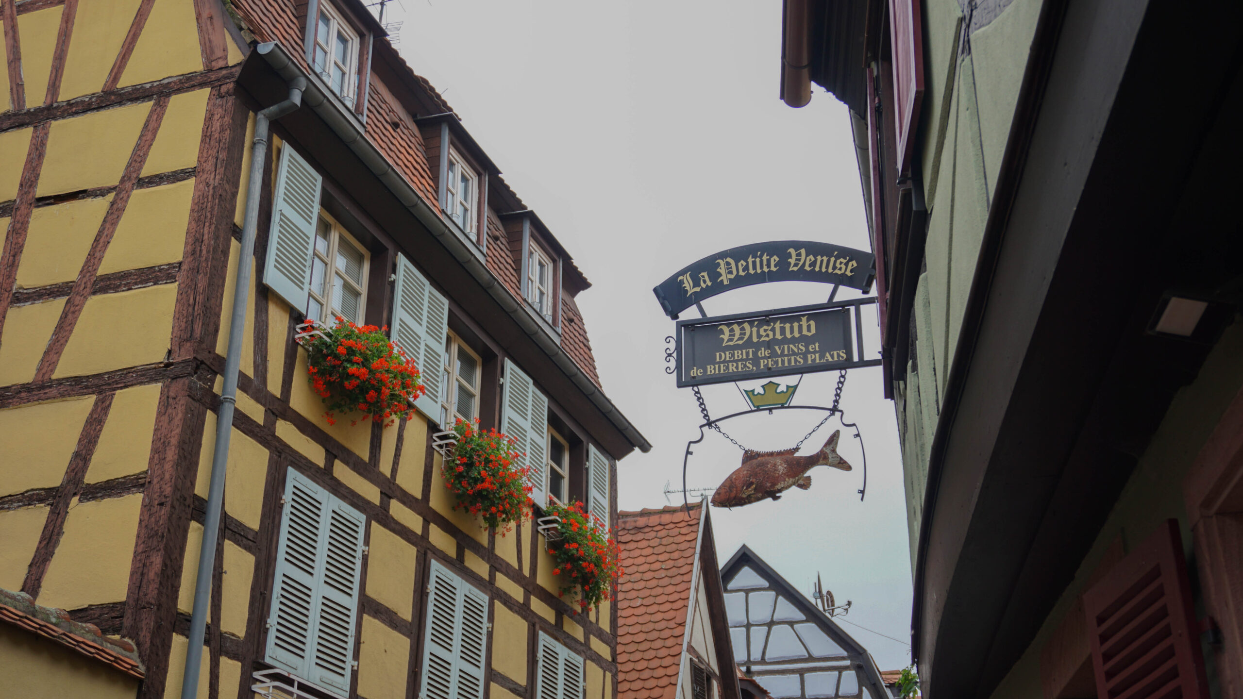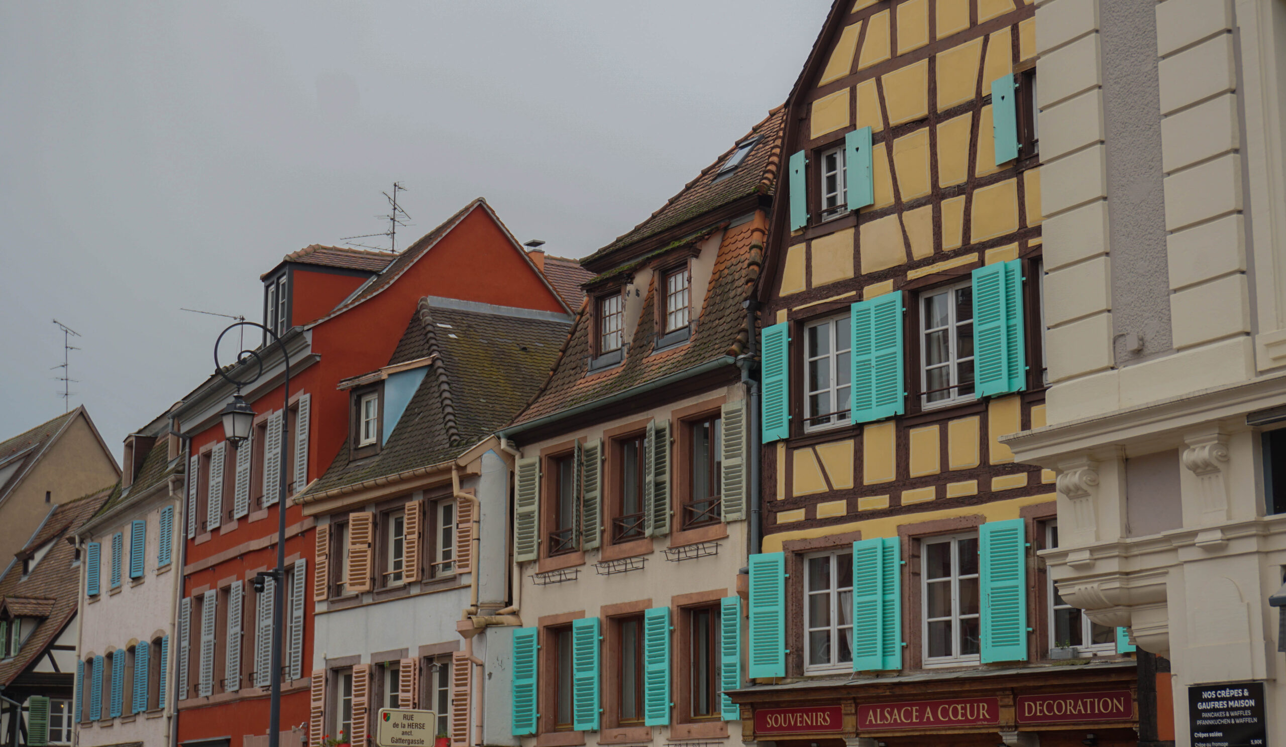 Ce matin, c’est notre premier jour de visite et nous partons en direction de Colmar, la ville que nous voulions le plus faire. Et on avait un bon pressentiment, car la ville est absolument magnifique. Les toitures vert et rouge, les motifs que créent les tuiles et leur brillance, ça nous captive tout de suite. L’architecture est magnifique, pleine de détails, tout est à colombages, des petites enseignes en fer forgé décorent les magasins et organisent la ville, tout est beau. J’ai été de les collectionner en photos tellement j’ai adoré ses petites enseignes accrochées partout.