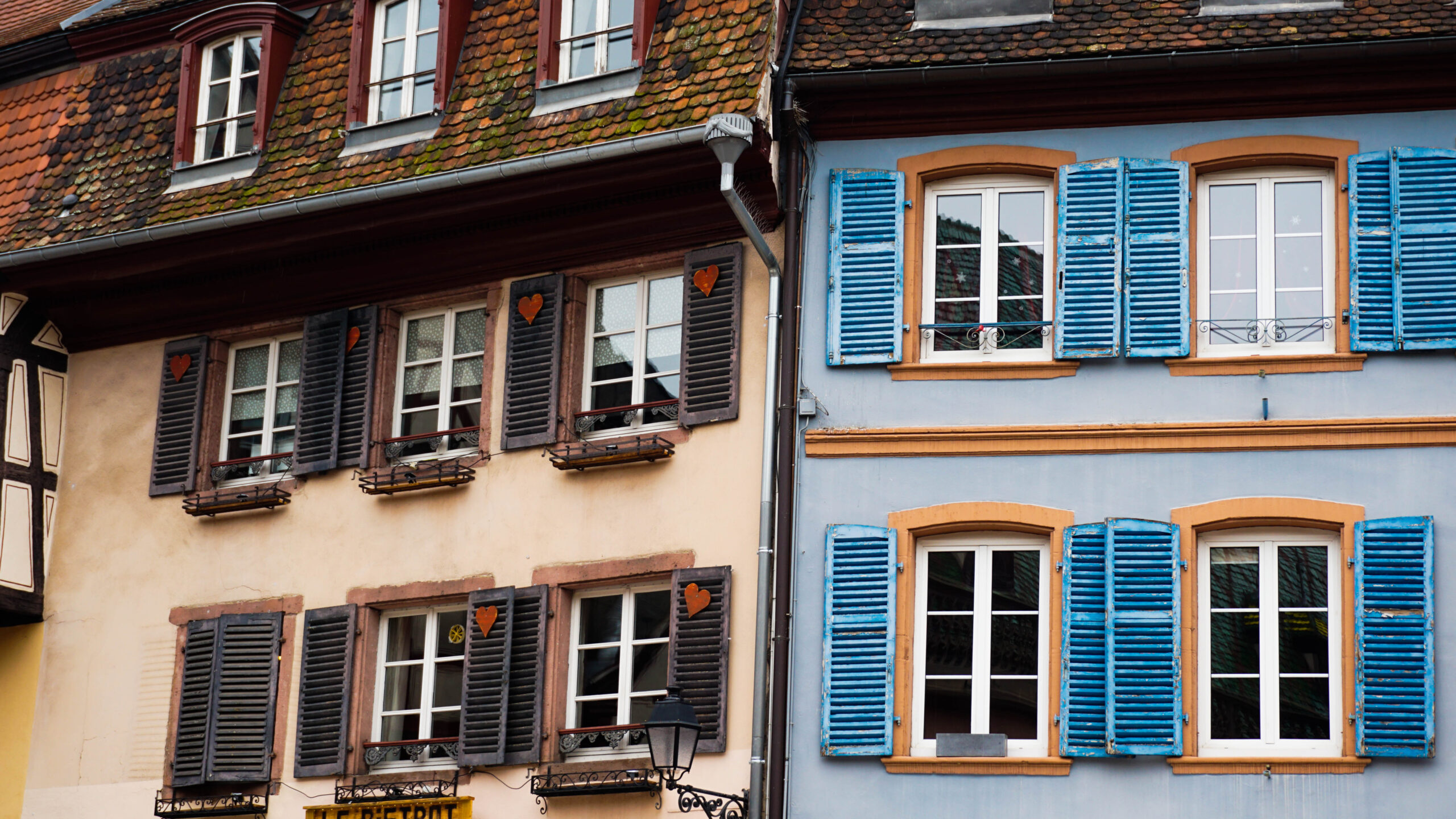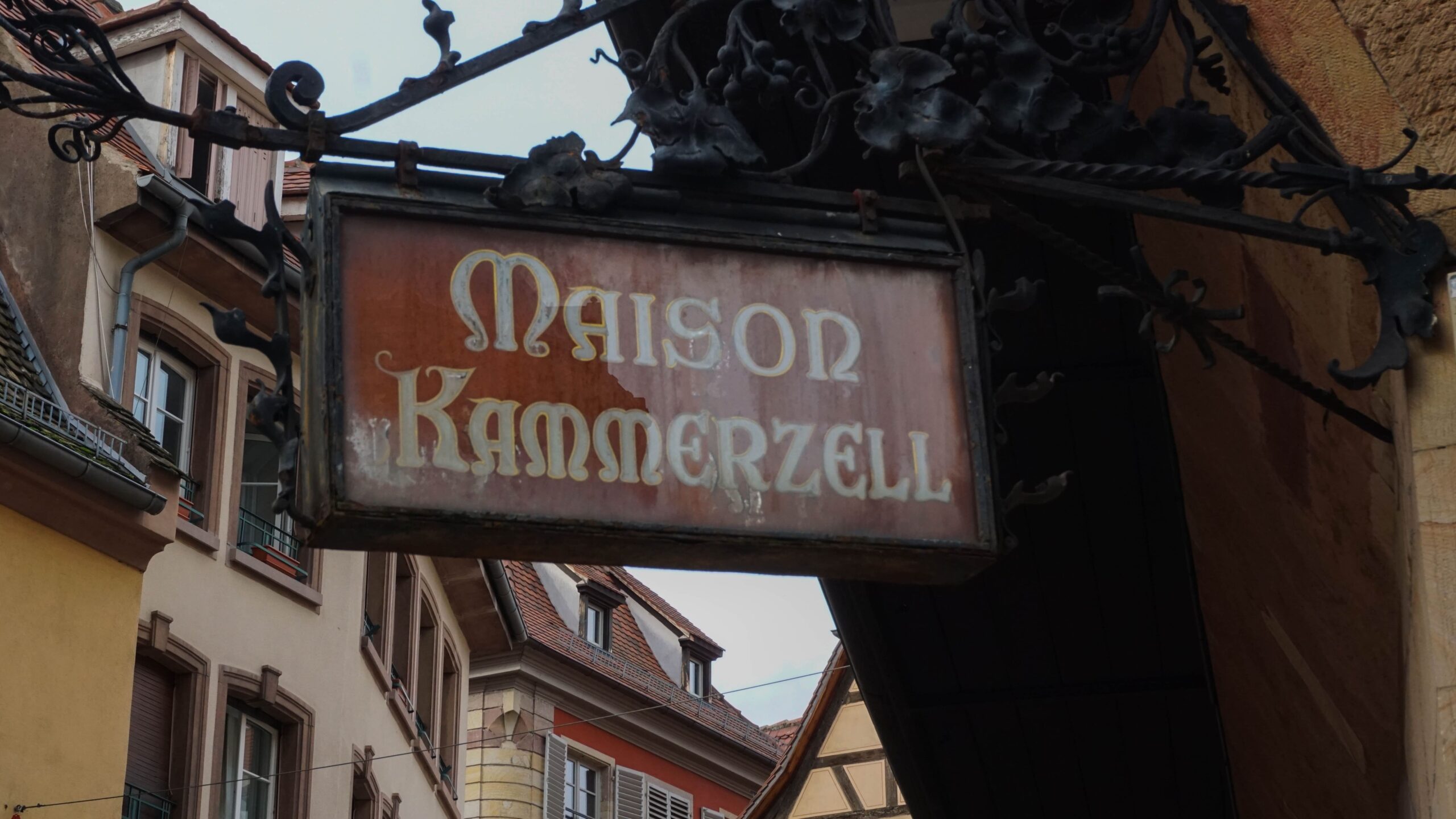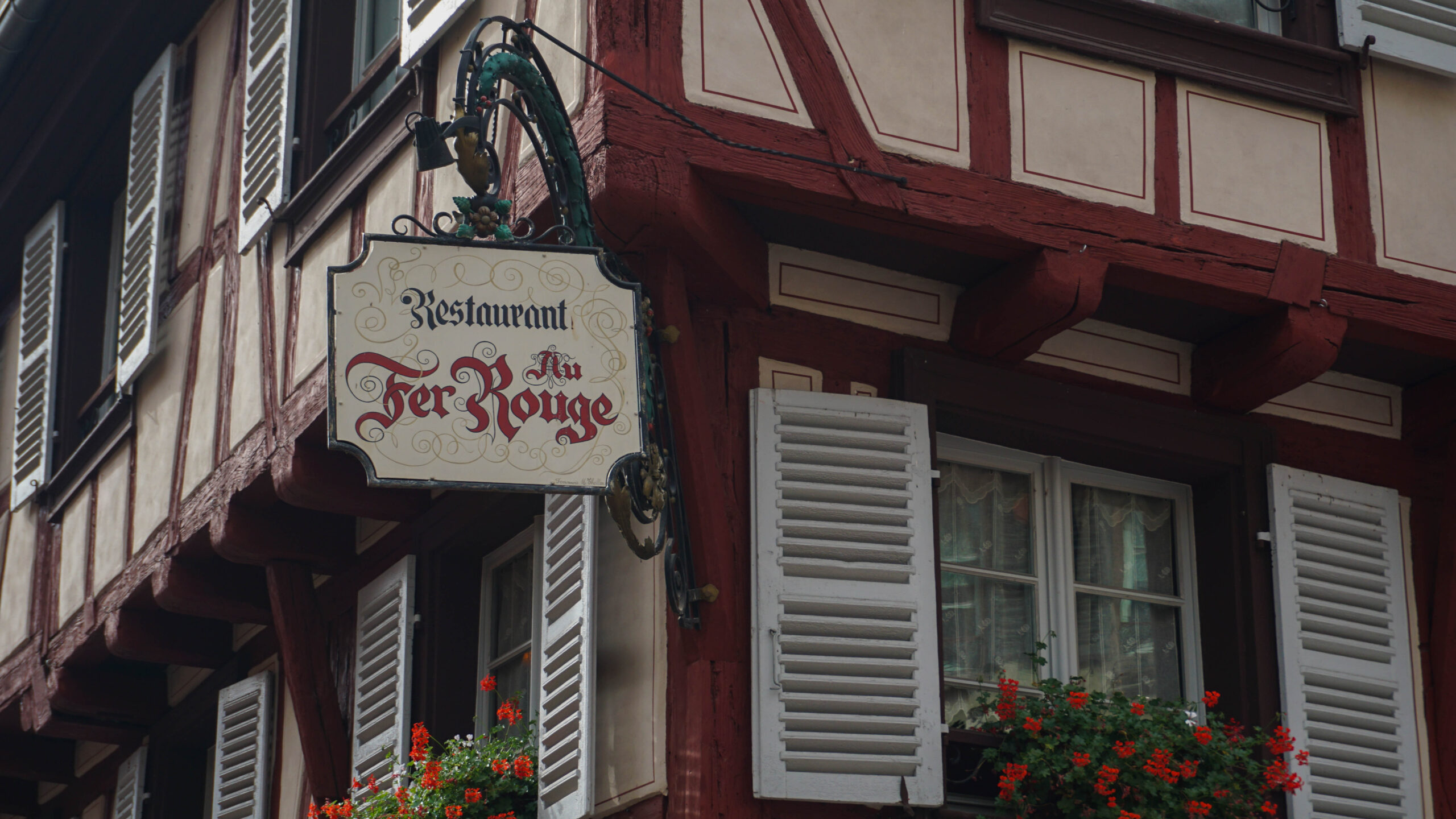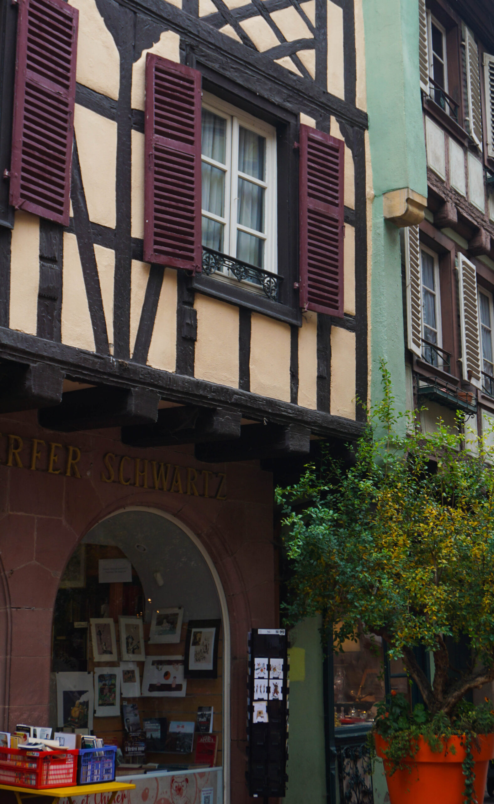 Ce matin, c’est notre premier jour de visite et nous partons en direction de Colmar, la ville que nous voulions le plus faire. Et on avait un bon pressentiment, car la ville est absolument magnifique. Les toitures vert et rouge, les motifs que créent les tuiles et leur brillance, ça nous captive tout de suite. L’architecture est magnifique, pleine de détails, tout est à colombages, des petites enseignes en fer forgé décorent les magasins et organisent la ville, tout est beau. J’ai été de les collectionner en photos tellement j’ai adoré ses petites enseignes accrochées partout.