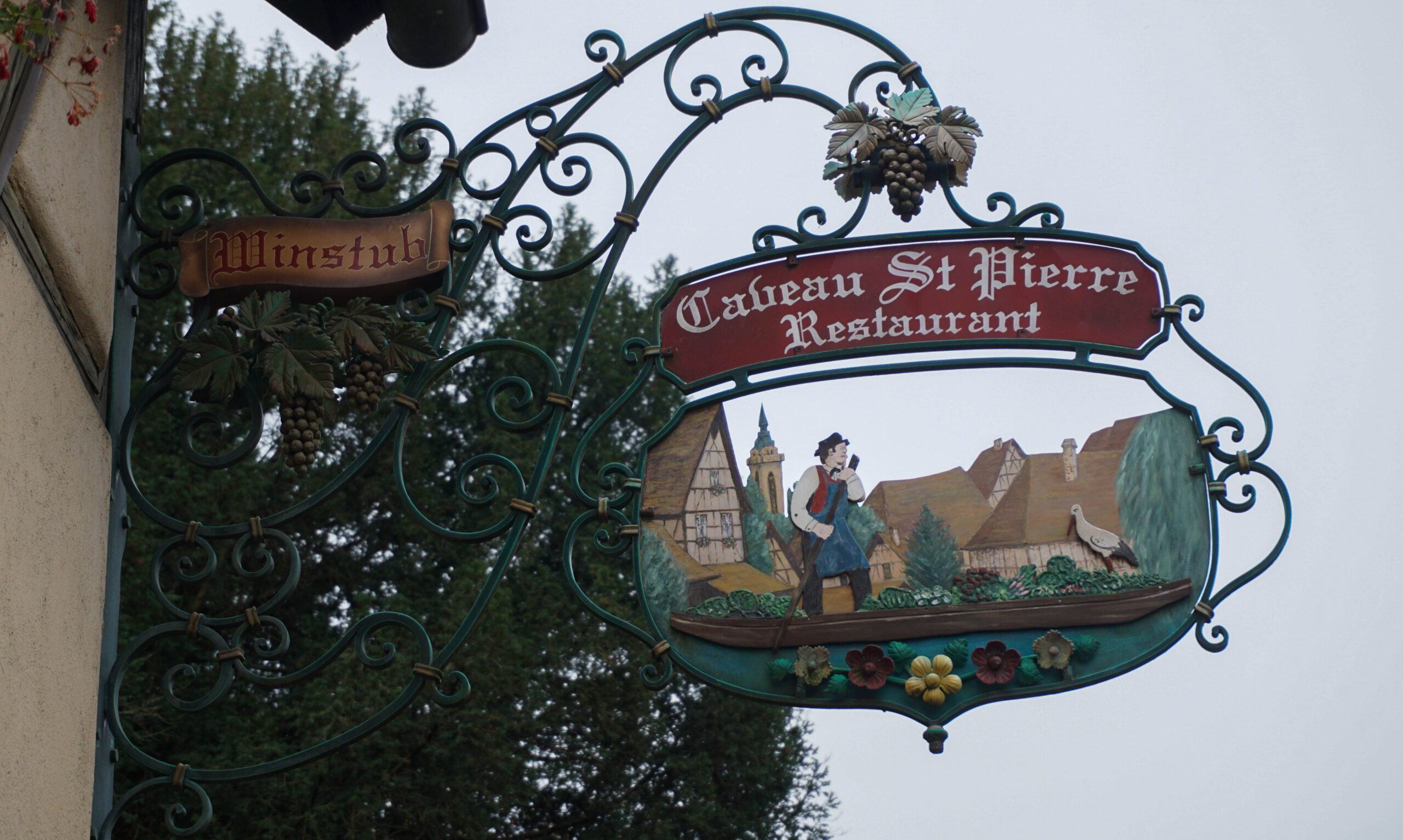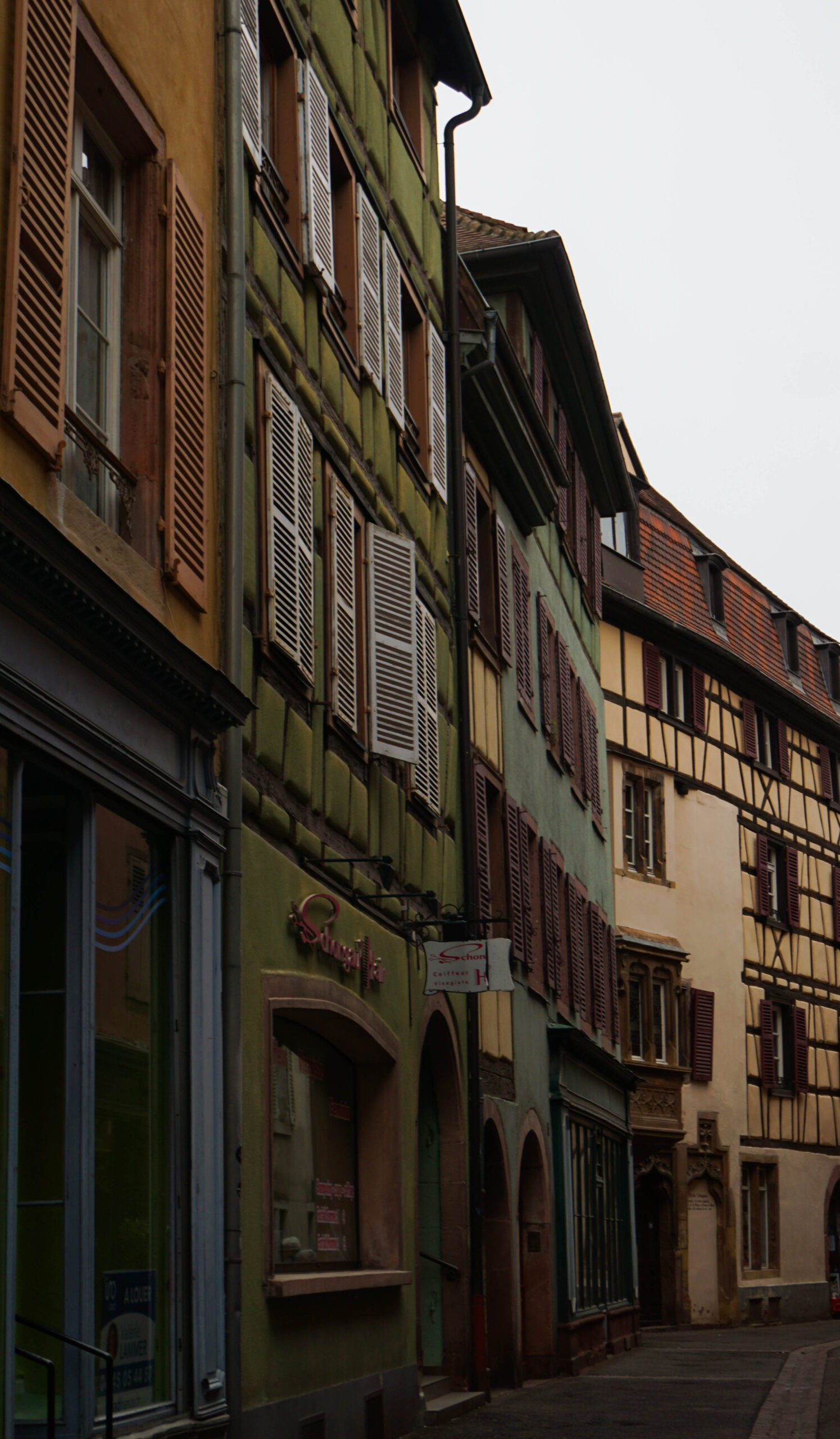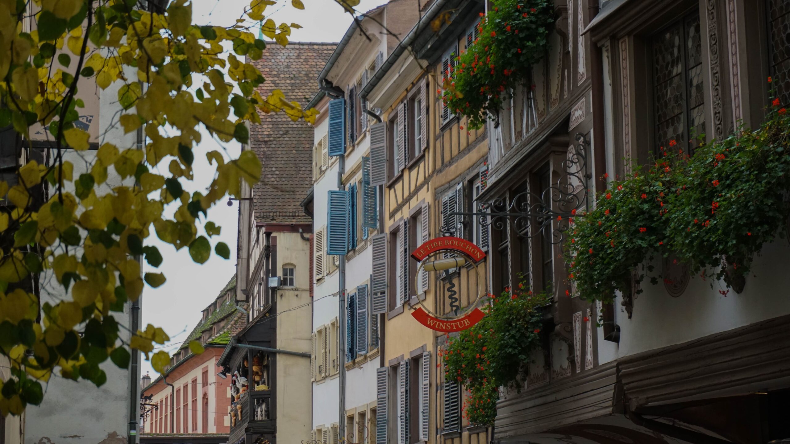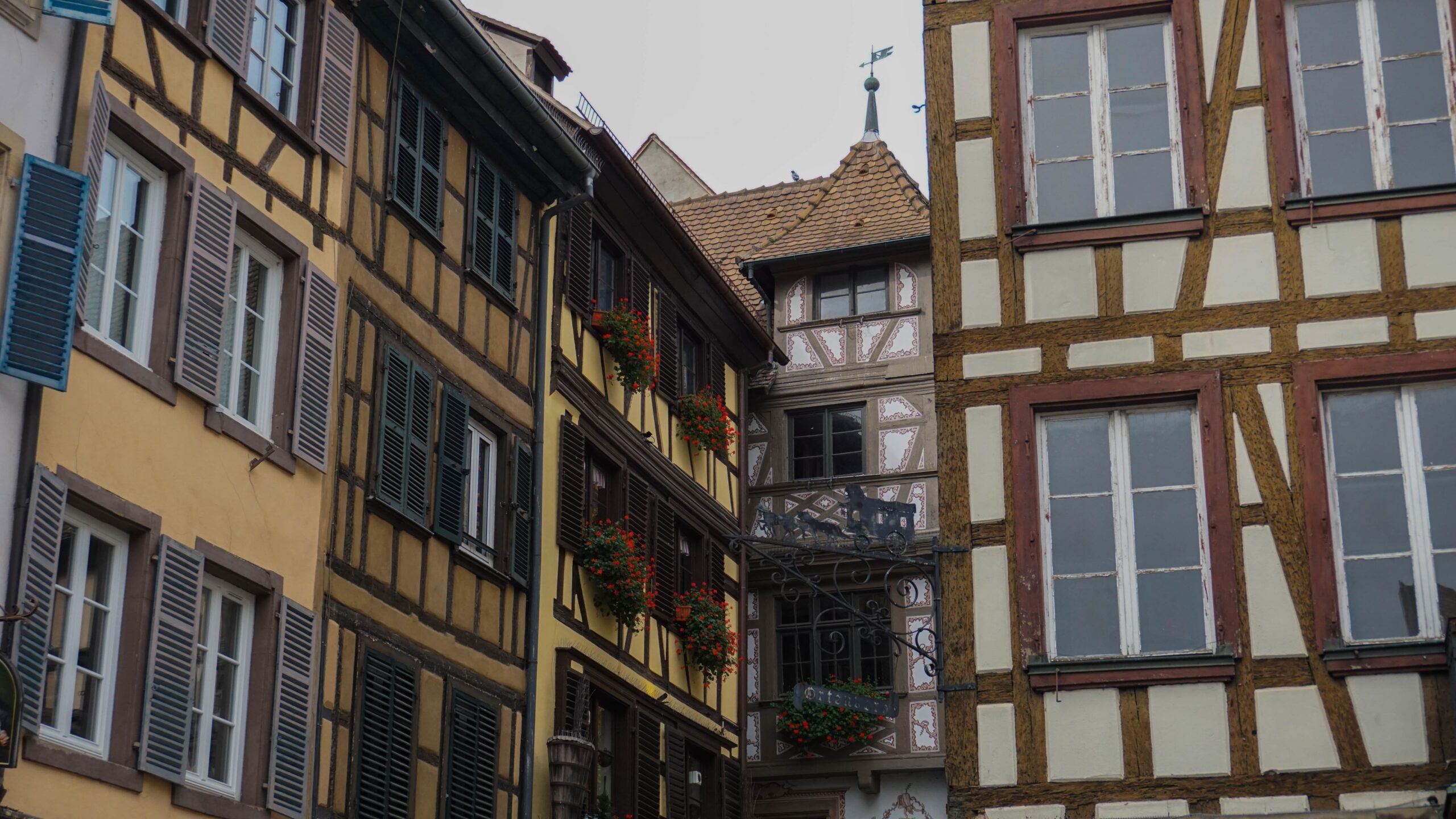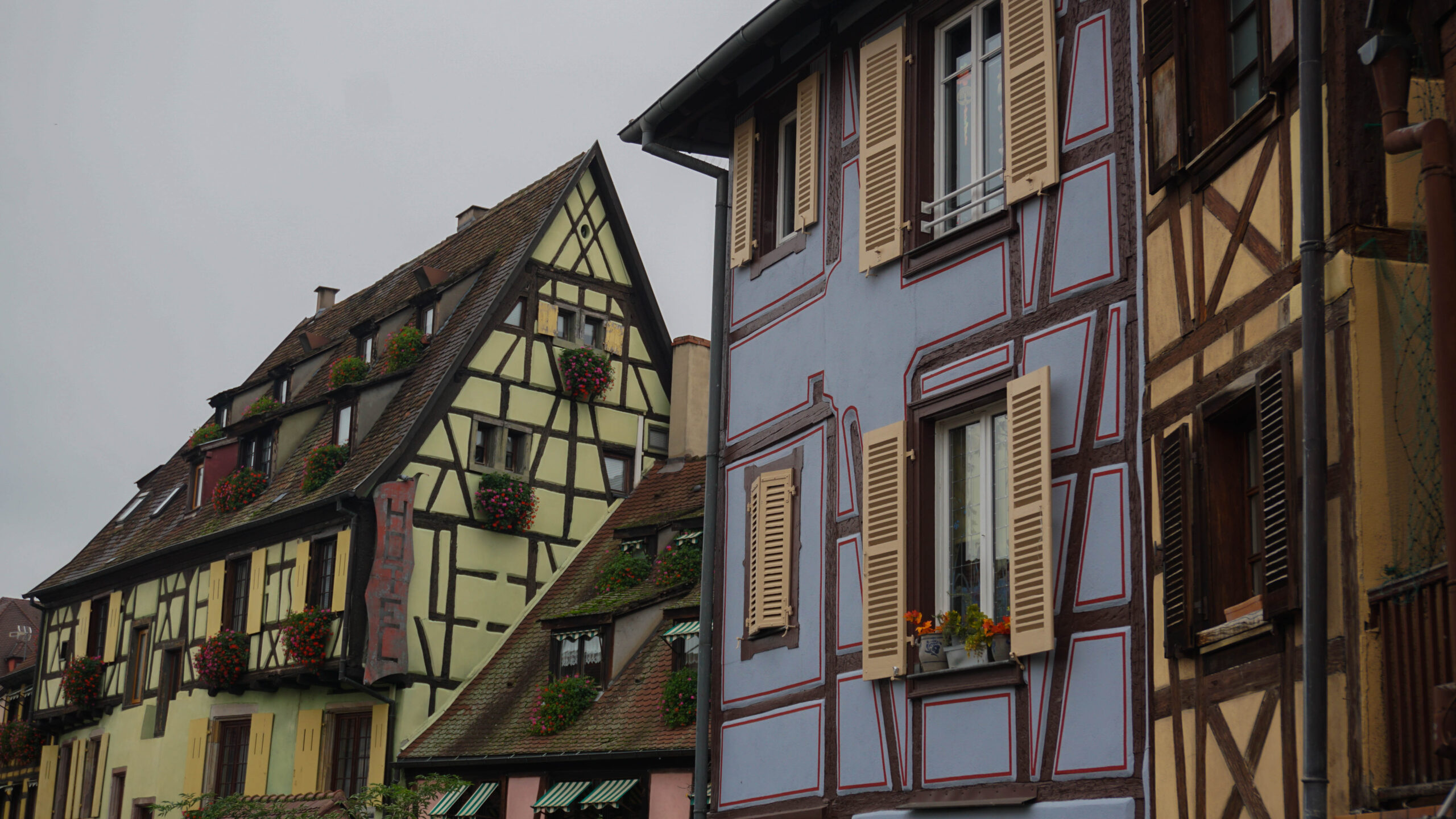 Ce matin, c’est notre premier jour de visite et nous partons en direction de Colmar, la ville que nous voulions le plus faire. Et on avait un bon pressentiment, car la ville est absolument magnifique. Les toitures vert et rouge, les motifs que créent les tuiles et leur brillance, ça nous captive tout de suite. L’architecture est magnifique, pleine de détails, tout est à colombages, des petites enseignes en fer forgé décorent les magasins et organisent la ville, tout est beau. J’ai été de les collectionner en photos tellement j’ai adoré ses petites enseignes accrochées partout.