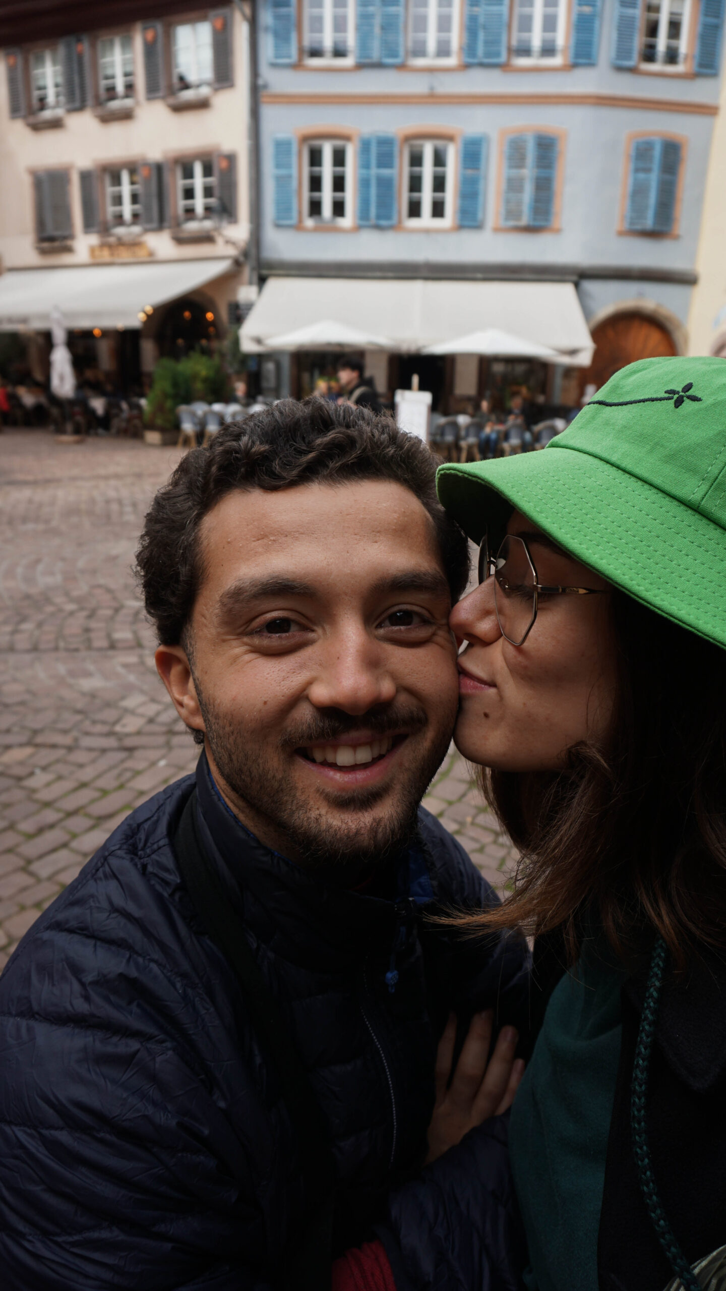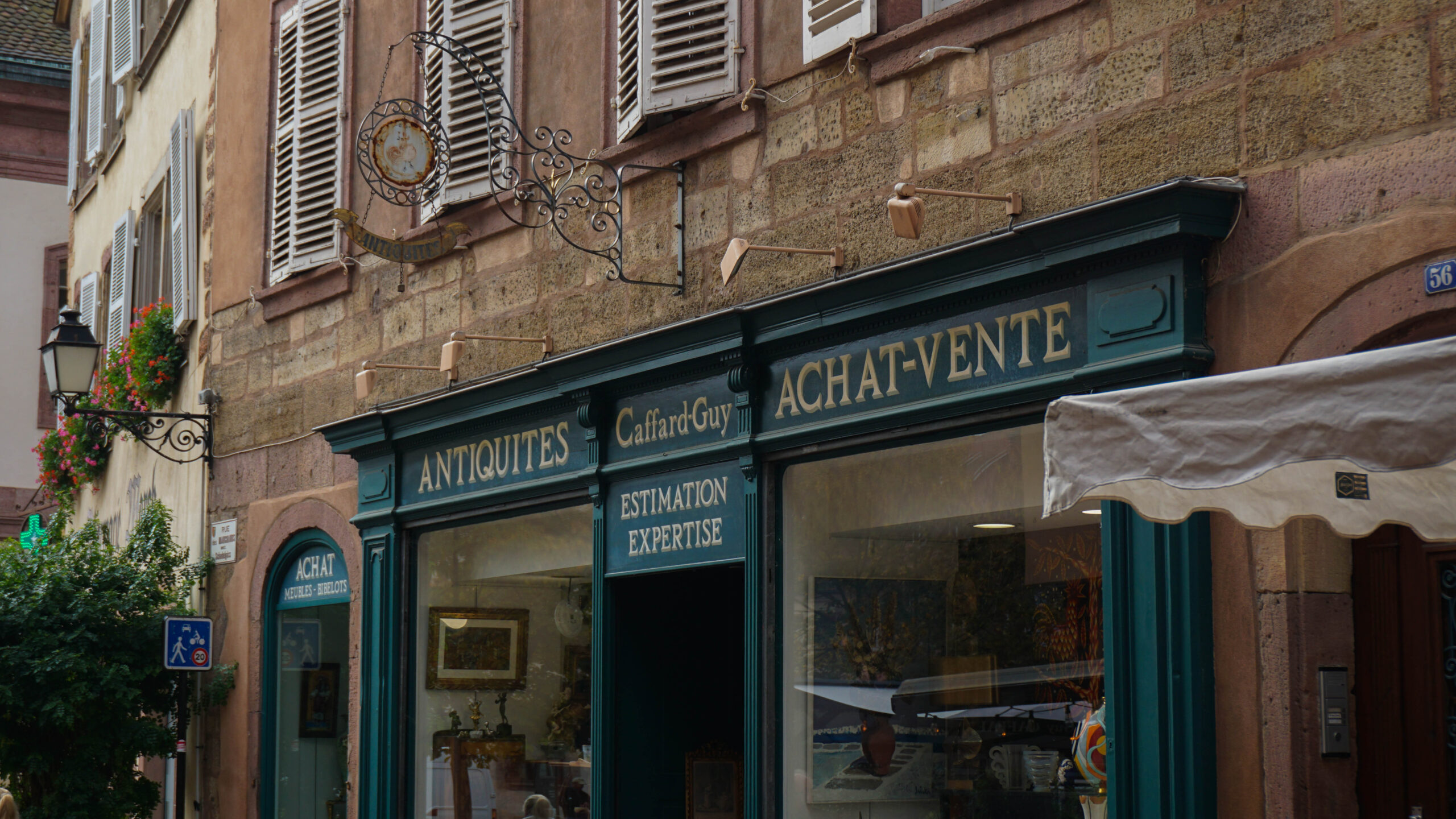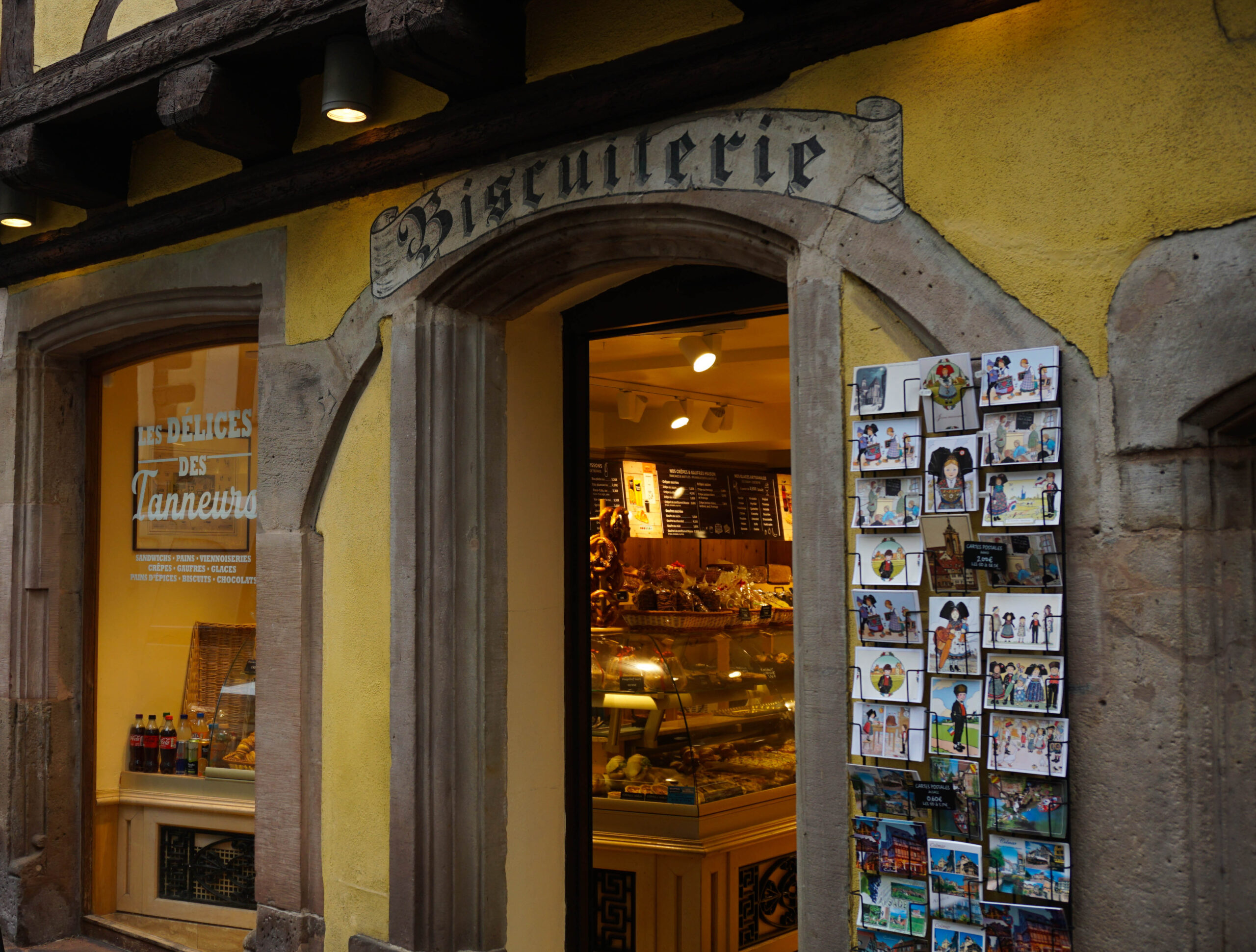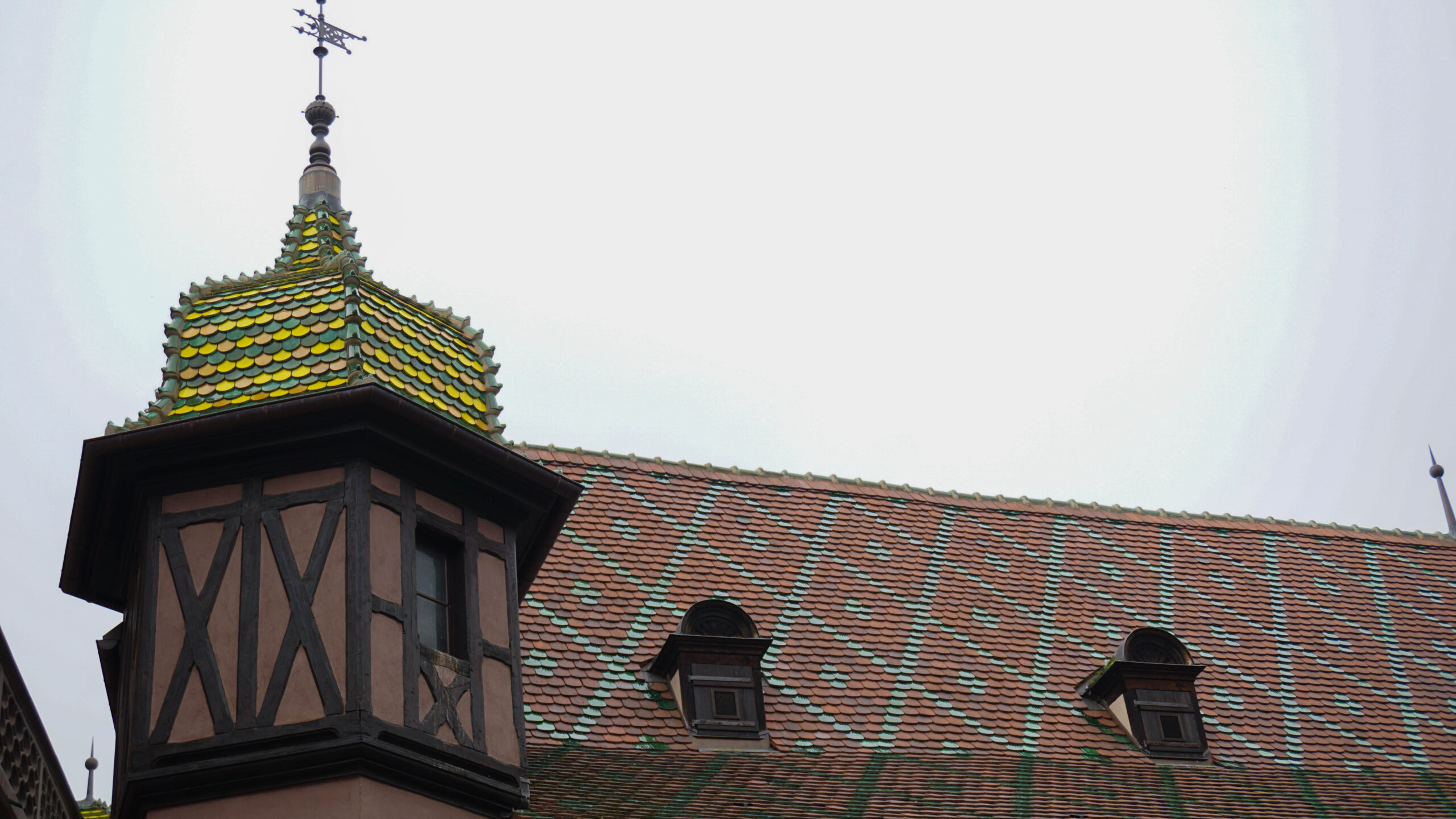 Ce matin, c’est notre premier jour de visite et nous partons en direction de Colmar, la ville que nous voulions le plus faire. Et on avait un bon pressentiment, car la ville est absolument magnifique. Les toitures vert et rouge, les motifs que créent les tuiles et leur brillance, ça nous captive tout de suite. L’architecture est magnifique, pleine de détails, tout est à colombages, des petites enseignes en fer forgé décorent les magasins et organisent la ville, tout est beau. J’ai été de les collectionner en photos tellement j’ai adoré ses petites enseignes accrochées partout.