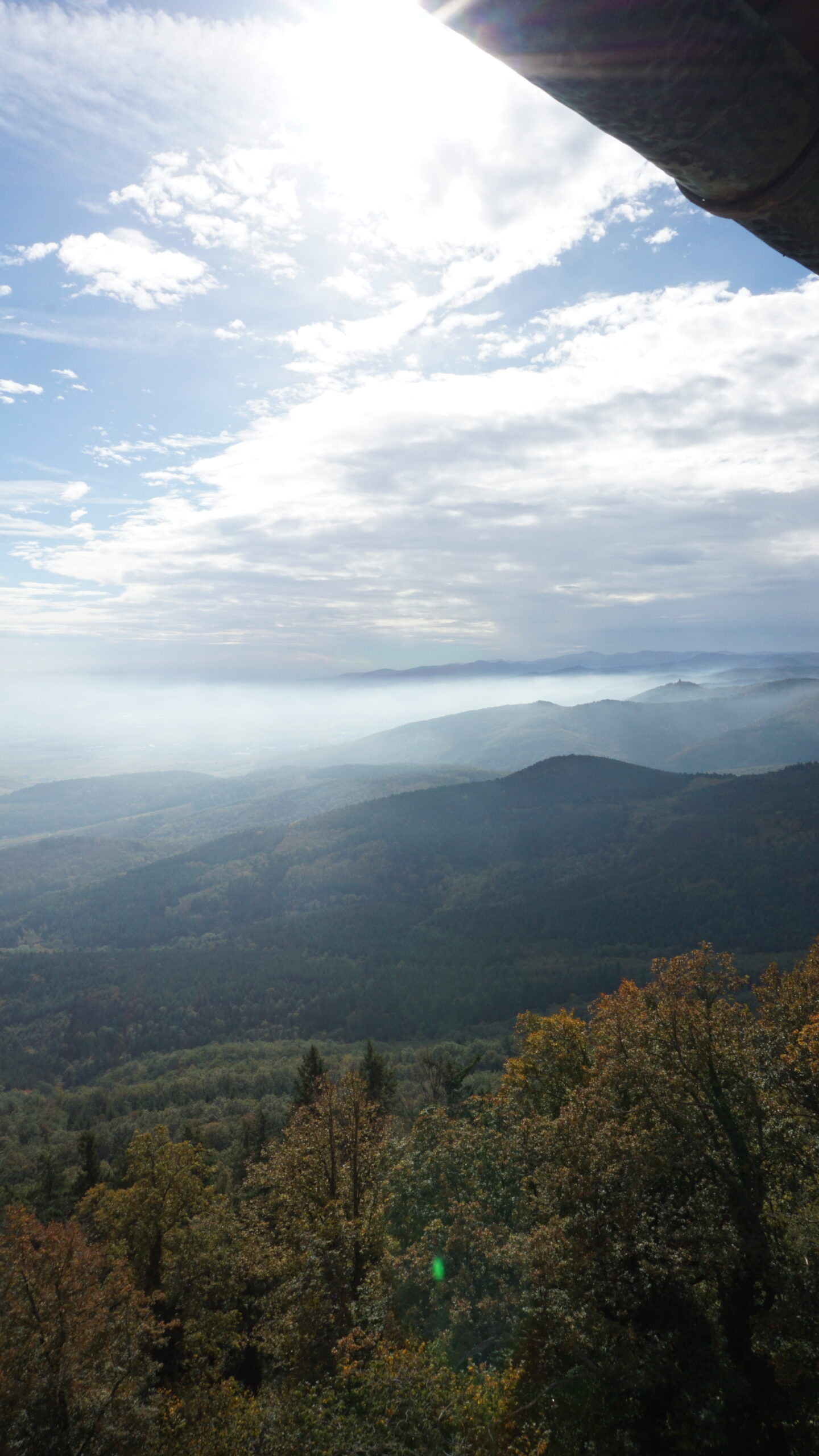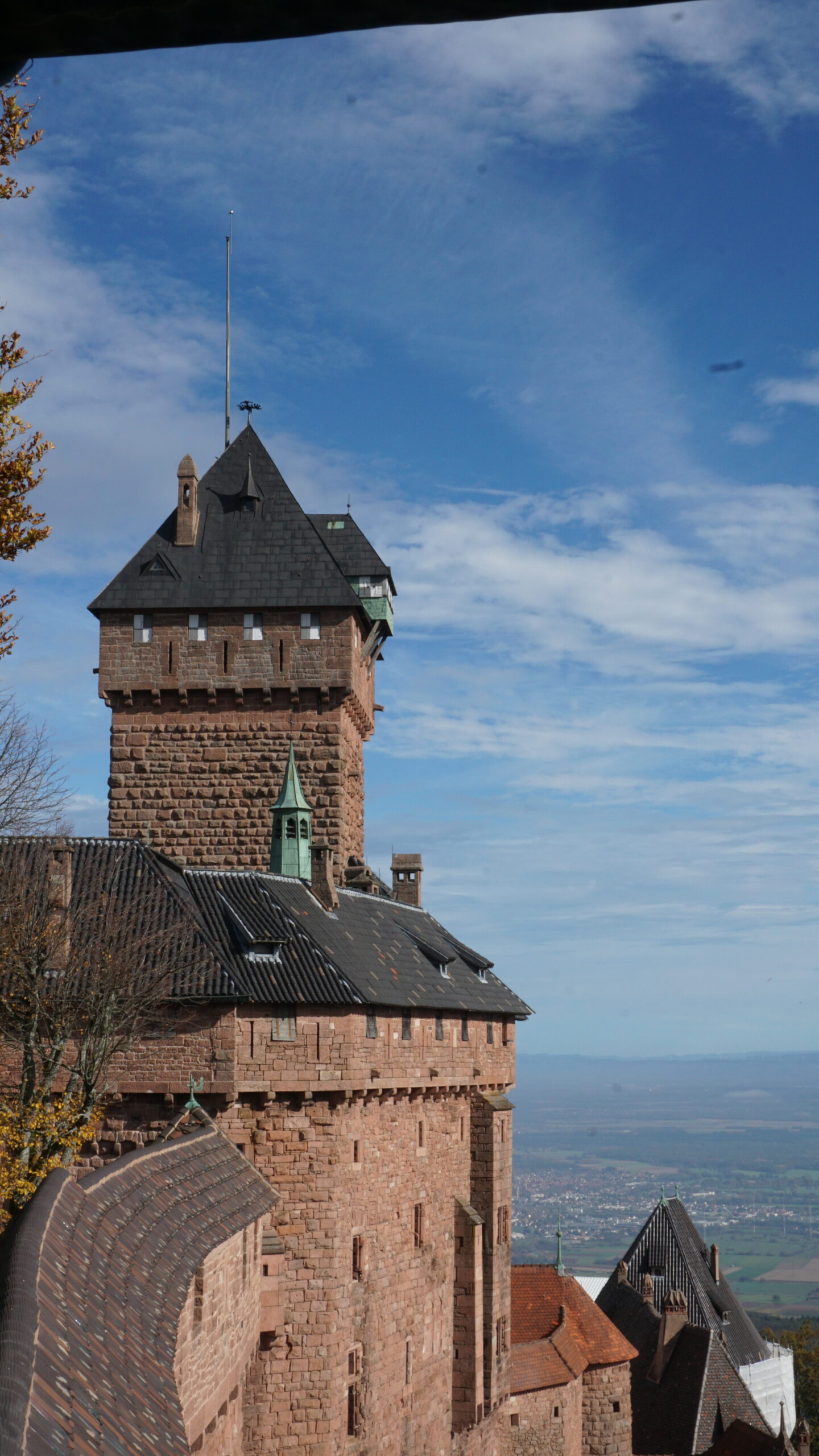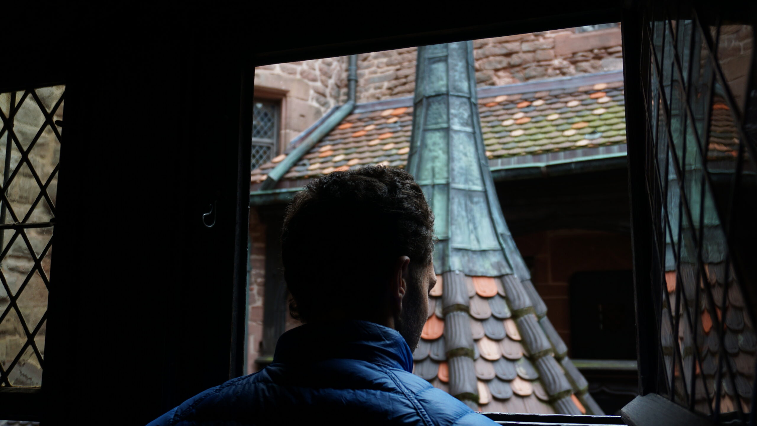 On commence ensuite la visite du château. C’est un amoncellement de couloirs, d’escaliers, de pièces un peu vides mais belles, avec des armes parfois, des fresques, des meubles anciens sculptés. On en apprend sur la vie du château. Il y a un petit jardin intérieur avec une jolie vue. On essaye d’ouvrir chaque fenêtre et on y arrive parfois, ce qui nous offre de jolies vues sur l’extérieur. La plus belle reste celle en arrivant tout en haut, à l’endroit où sont placés les canons pour défendre le château. Le soleil nous rejoint et donne une vue magnifique sur les Vosges.
