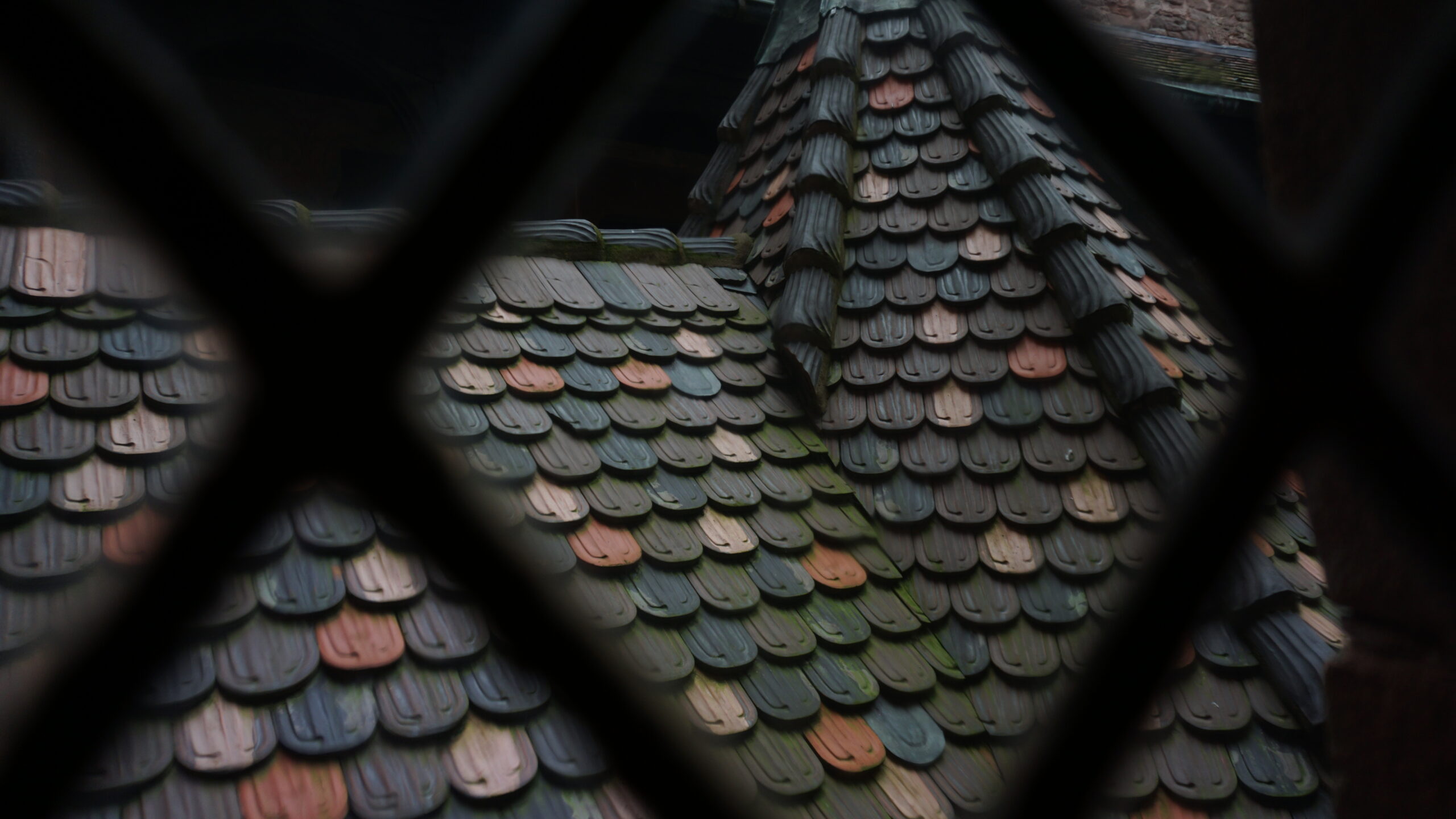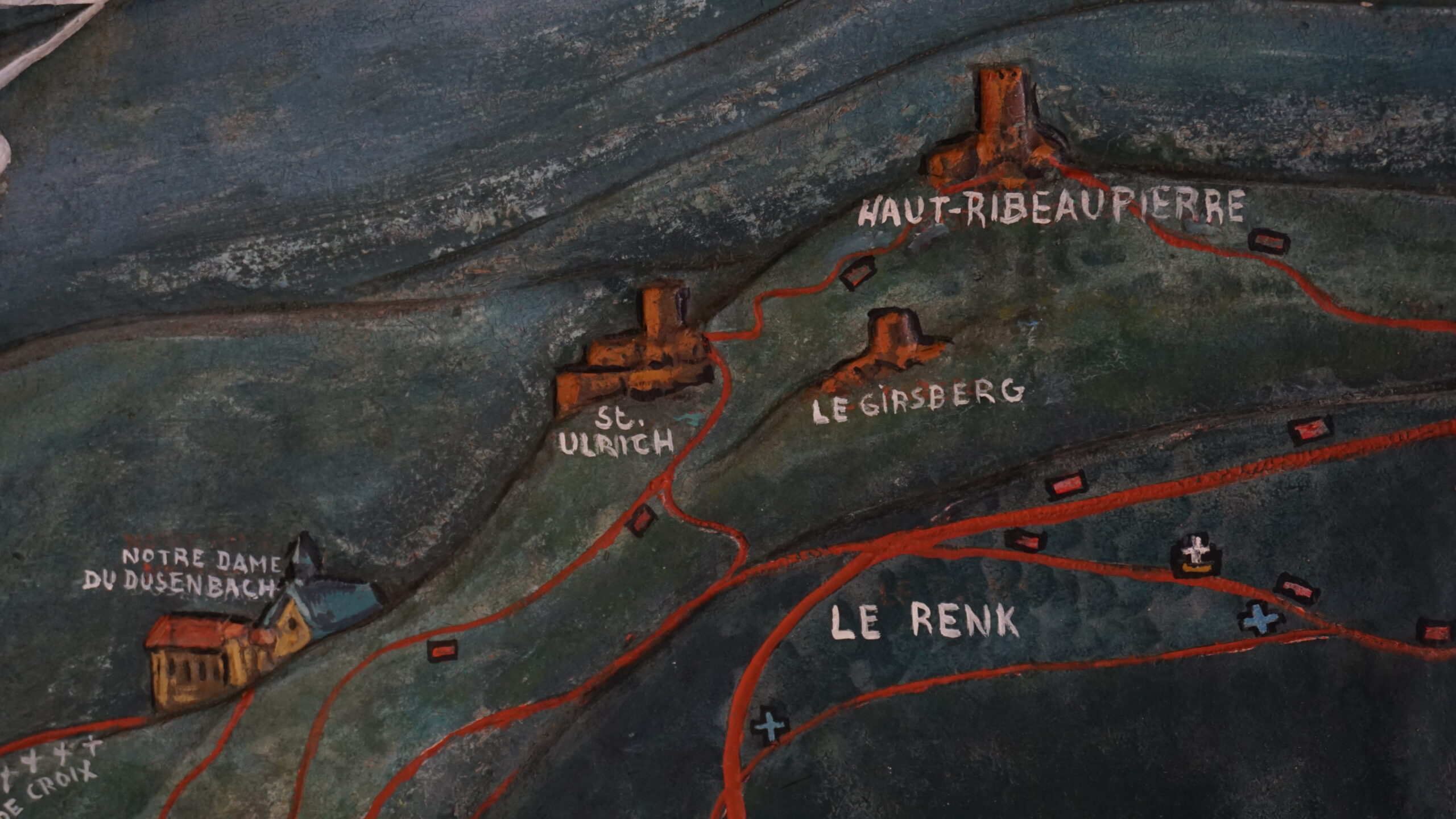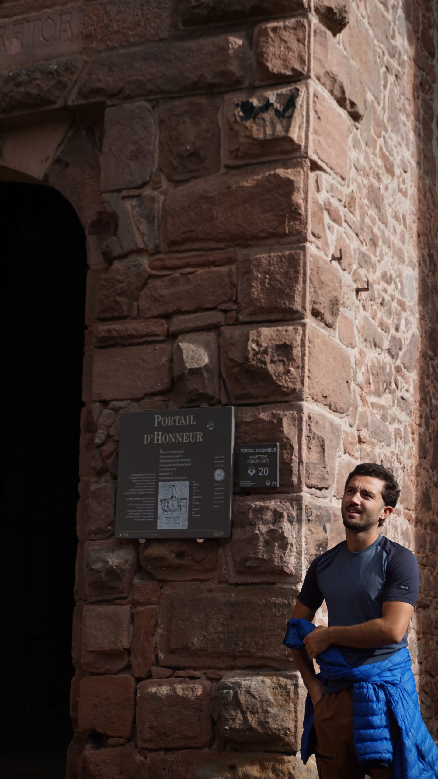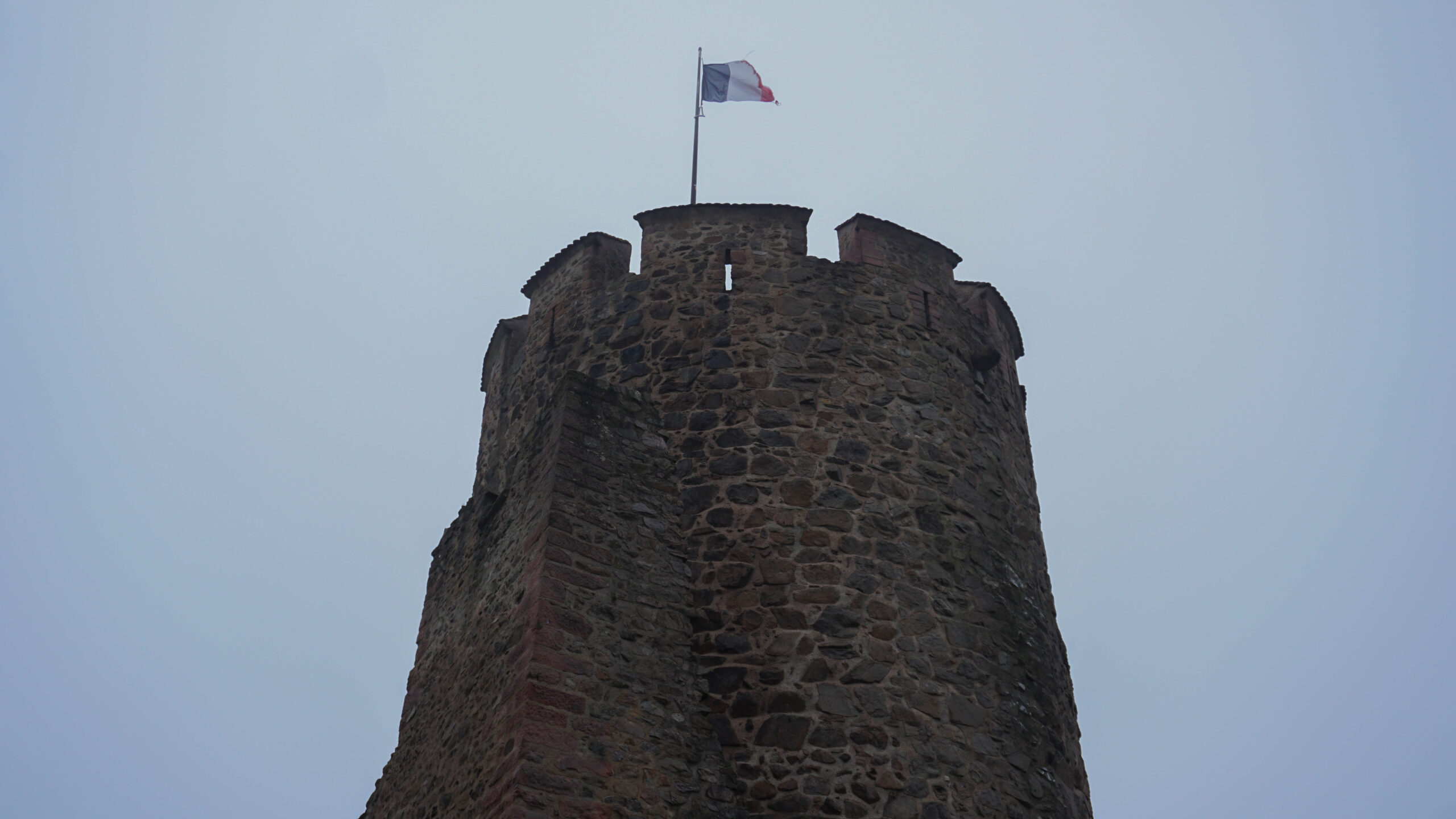 On commence ensuite la visite du château. C’est un amoncellement de couloirs, d’escaliers, de pièces un peu vides mais belles, avec des armes parfois, des fresques, des meubles anciens sculptés. On en apprend sur la vie du château. Il y a un petit jardin intérieur avec une jolie vue. On essaye d’ouvrir chaque fenêtre et on y arrive parfois, ce qui nous offre de jolies vues sur l’extérieur. La plus belle reste celle en arrivant tout en haut, à l’endroit où sont placés les canons pour défendre le château. Le soleil nous rejoint et donne une vue magnifique sur les Vosges.