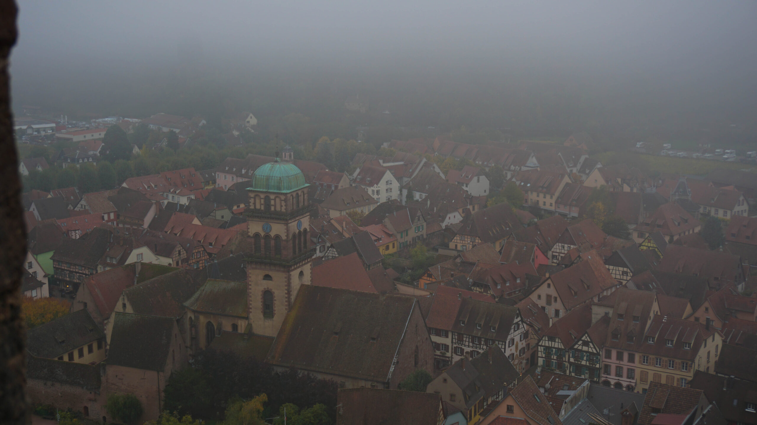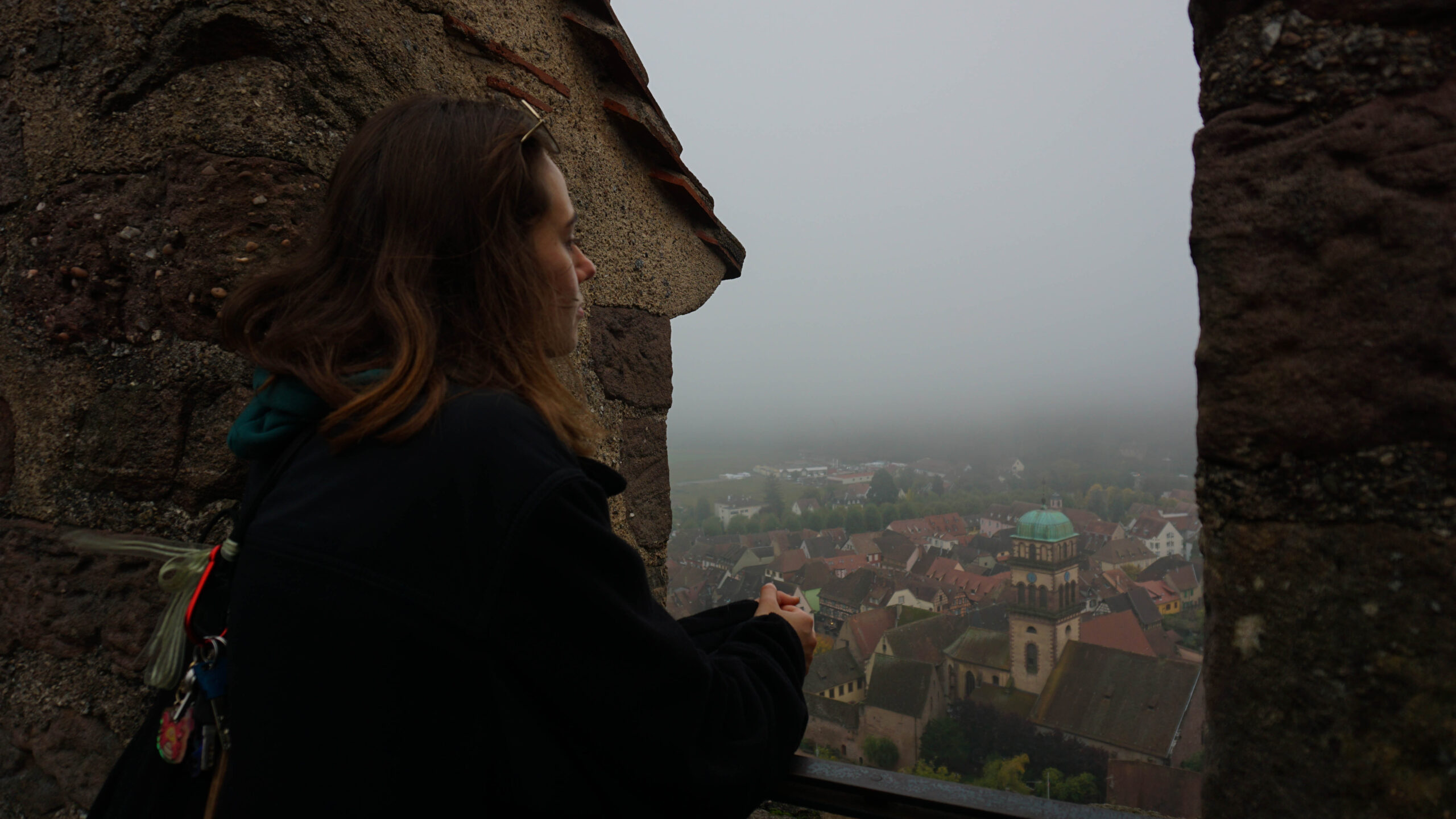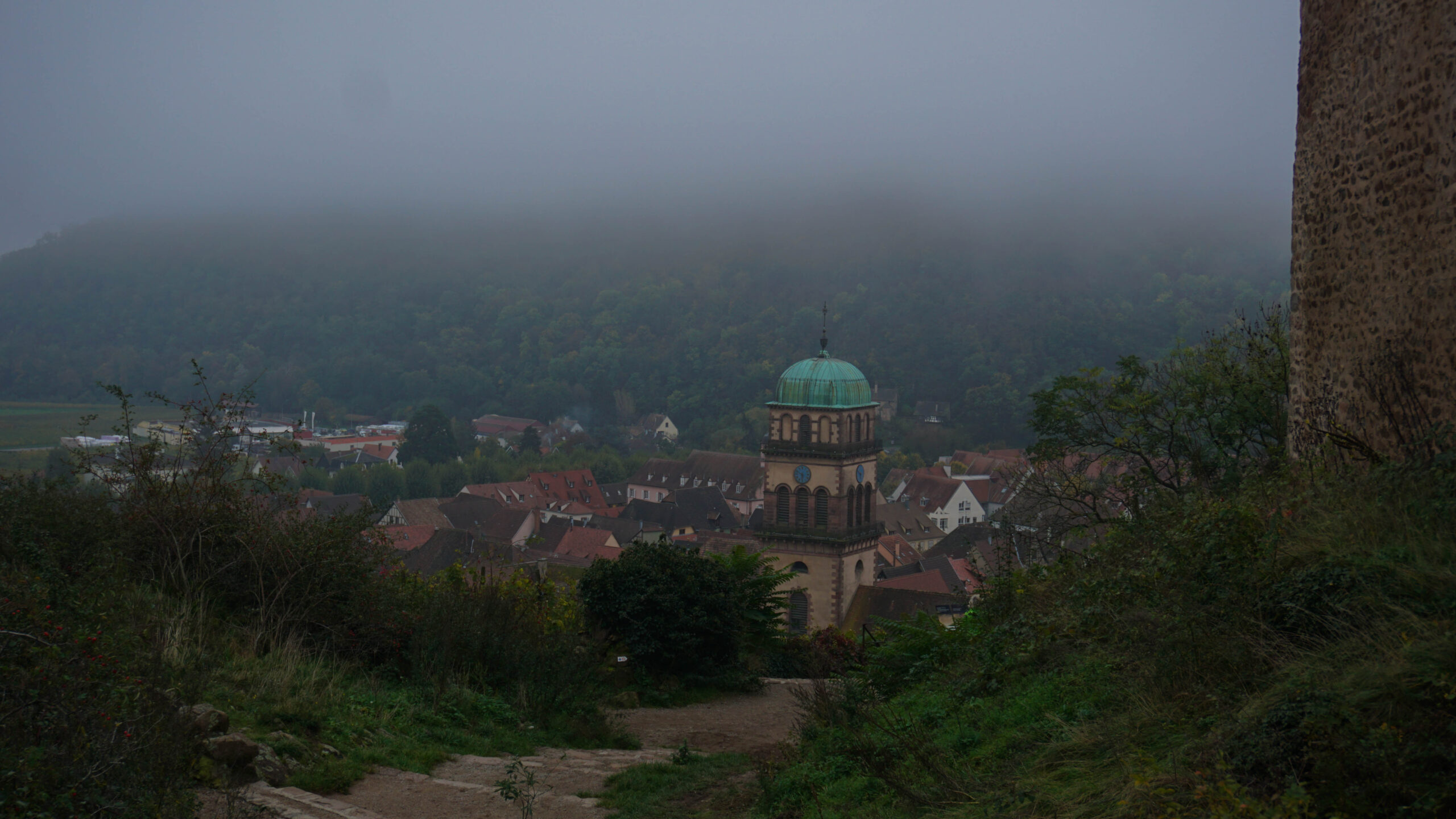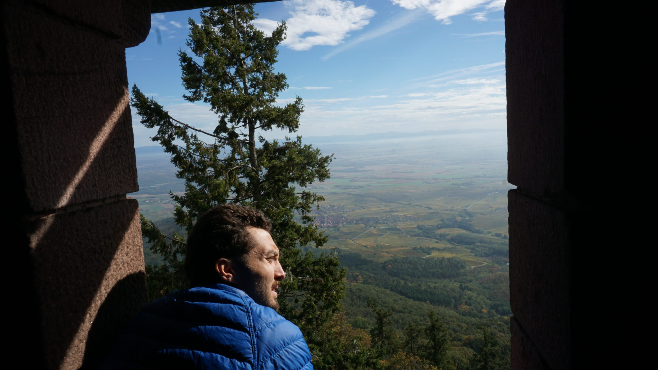On continue de se balader et malgré tous ces jolis éléments, sachez que la ville est plutôt morte. Peu de gens comme à Sélestat sauf que nous sommes en plein après-midi. Cependant, même si cela est mort, les vitrines donnent de la vie à la ville, car les Alsaciens mettent beaucoup d’effort dans leur vitrine d’Halloween. Un boucher a même mis un homme ensanglanté avec un couteau sur sa vitrine, il fallait oser ! Ce n’est pas à Paris que l’on verra ça. On aperçoit au loin un château. On ignore comment y aller, mais en se baladant dans les petites ruelles, on tombe sur un coin très champêtre qui donne sur les vignes. De là partent des sentiers. On commence notre ascension et bien que le château semble loin, en dix minutes, nous y étions. On a alors une jolie vue sur la ville. Mais en grimpant les 113 marches de la tour (oui, j’ai compté juste pour vous), on a encore une plus belle vue très étendue sur les vignobles jaune soleil. On y reste quelque temps puis nous redescendons pour atteindre la voiture et continuer notre journée.