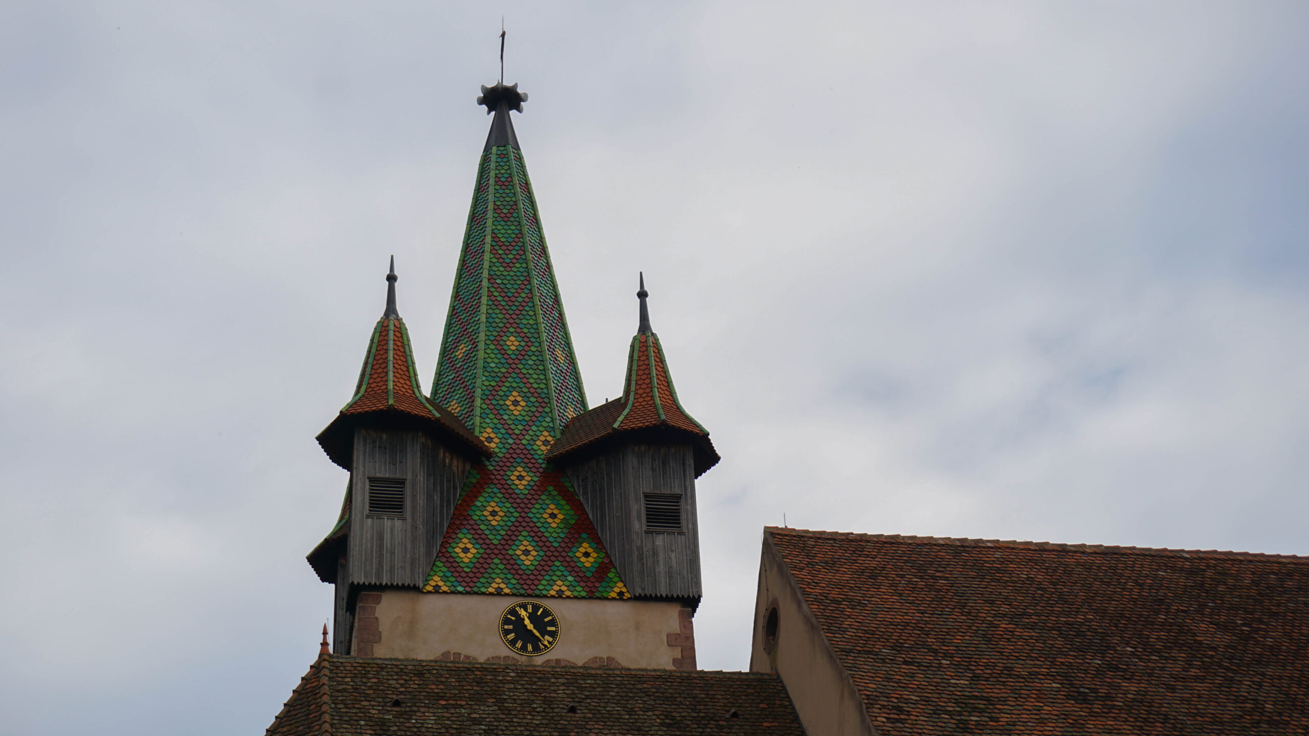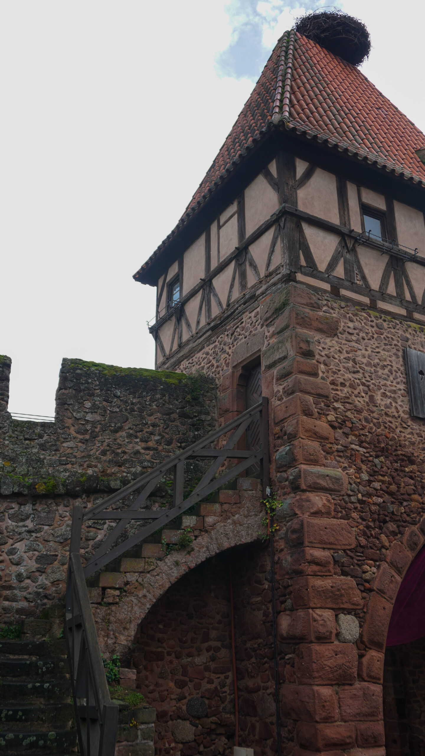 Au début du troisième jour, on se prépare, on range tout et on rend les clés du gîte. J’ai pris deux cartes et un petit cadeau pour ma maman à la boutique du gîte. On a un objectif ce matin, se rendre au château majestueux que l’on voit sur une colline depuis des jours, le château du haut Koenigsbourg. C’est notre direction pour aujourd’hui. Sur la route, nous traversons des petits villages dont un des premiers est châtelois. On s’y arrête, car je vois un petit marché avec un pâtissier et que je me dis qu’un poulet rôti serait une super idée pour ce midi. On s’arrête donc d’acheter un poulet et des râpés (le nom des Rösti de chez eux). Avant de repartir, on visite le village. On passe sous la tour de la sorcière qui est super belle puis on se dirige vers l’église avec un toit vert et rouge comme on les adore. On visite l’église, elle est super jolie et complètement vide. On se balade ensuite autour de l’église. Il y a plein de petits panneaux qui nous racontent l’histoire des remparts qui entourent le bâtiment. On apprend que les Suédois nous ont attaqués et on n’en avait jamais entendu parler.