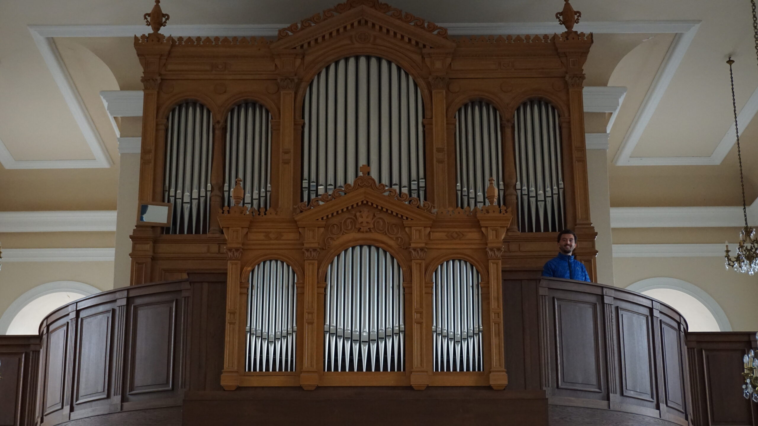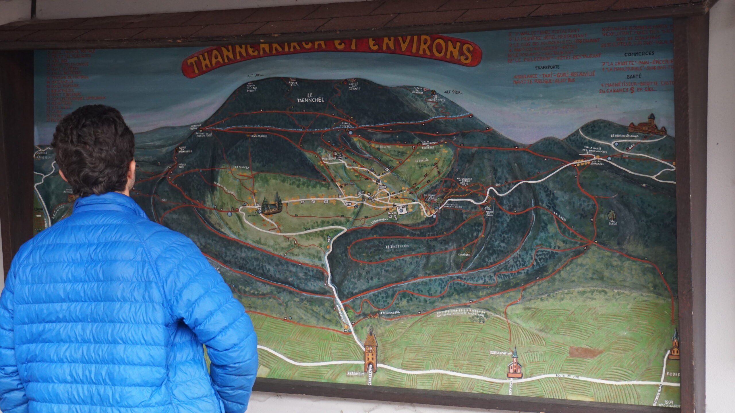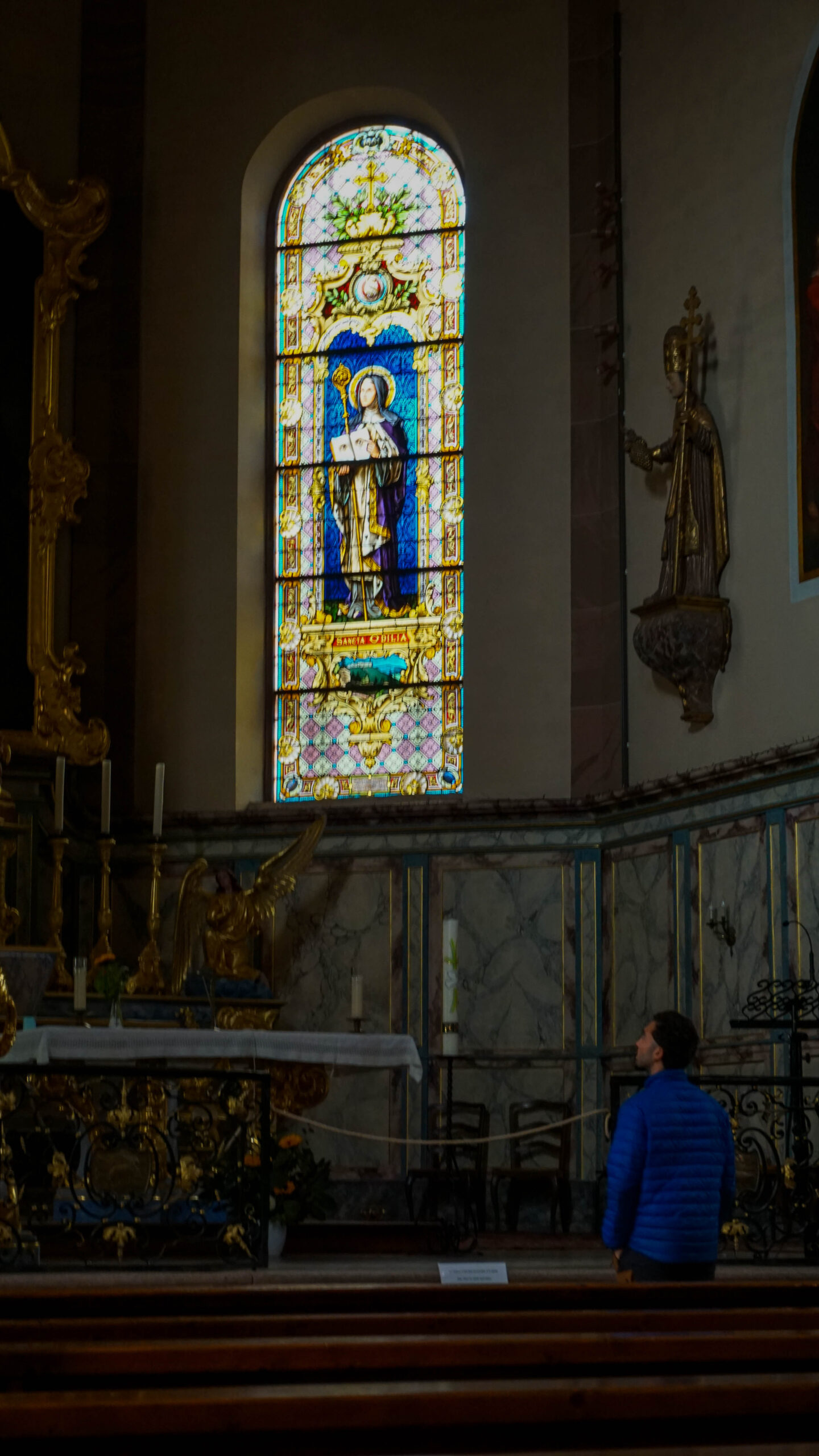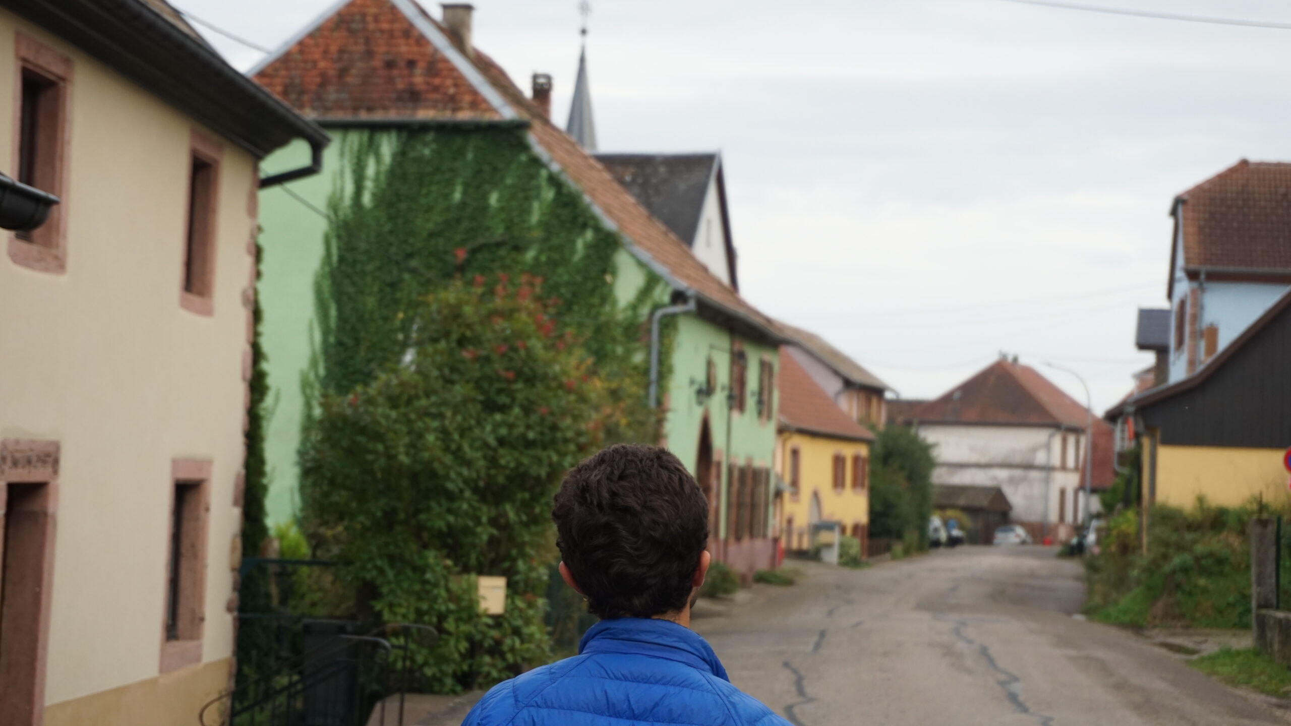 On se dirige vers le prochain village qui est celui d’Orschwiller. Évidemment, on a rien prévu donc on part visiter l’église. Il y a une fresque un peu laide, et même si l’église de l’extérieur est vraiment cool style marin, dedans elle est vraiment classique. On fait une photo d’Alexandre près d’un orgue. En sortant, on voit une dégustation de vin. On passe la petite porte, mais on ne voit personne. D’un coup, un détecteur de mouvement se met à sonner assez fort. On entend une grand-mère qui parle un peu fort et nous demande pourquoi nous sommes là. Honnêtement, je n’ai pas la force de parler, je fais juste demi-tour. Mais Ax essaye et quand elle dit qu’elle arrive, il part.