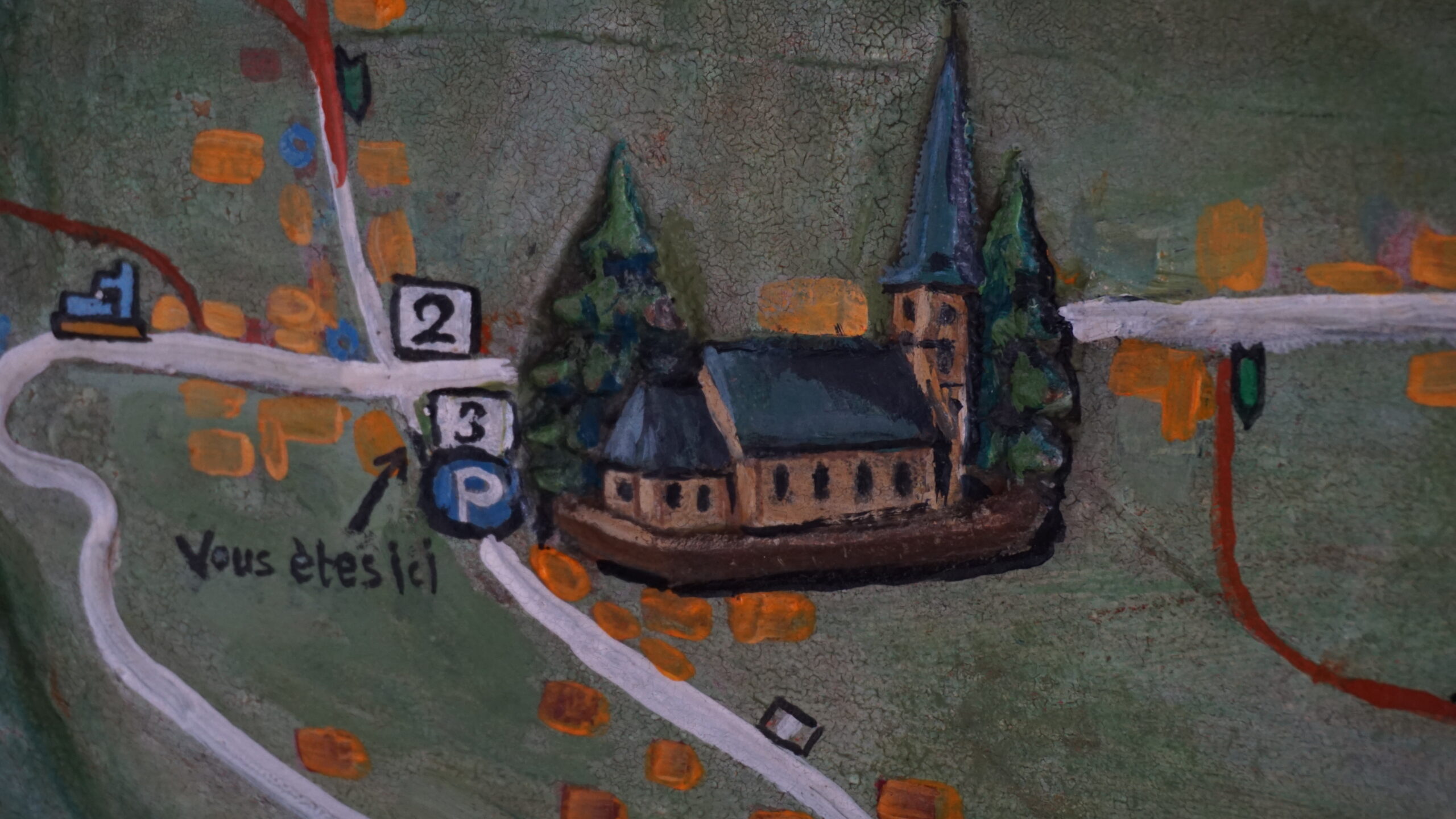 Nous partons visiter l’église, mais devant, nous tombons sur une carte en 3D assez jolie maintenant que j’y repense qui nous montre là où nous sommes et les alentours.